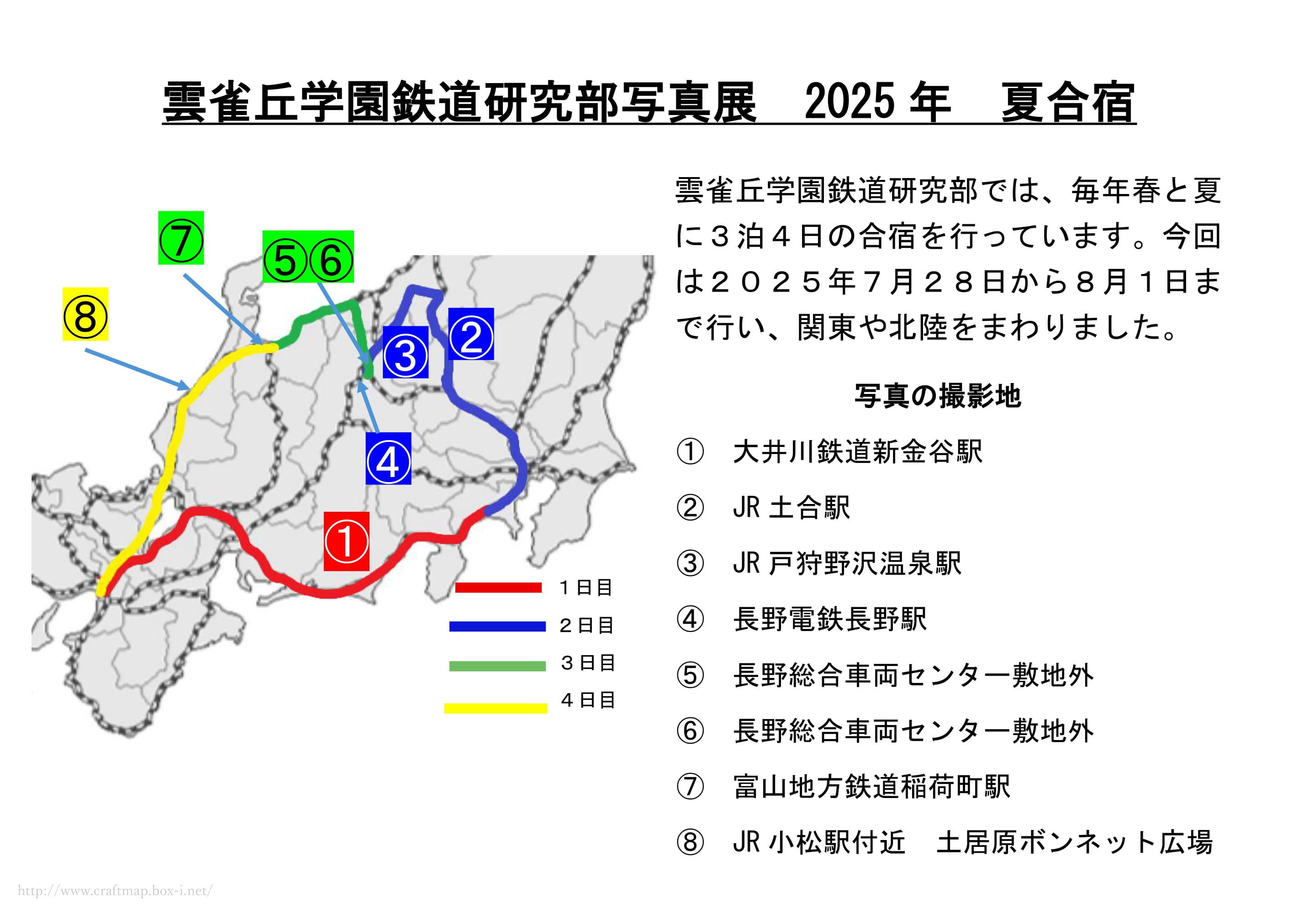 写真左側は、10/20まで阪急大阪梅田駅構内ギャラリーコーナー(中央改札と茶屋町改札との連絡通路上)にて開催している雲雀丘学園・龍谷大平安・清風・東山鉄道研究部合同写真展(平安・清風は10/10で終了)(阪急電鉄のwebサイト「阪急沿線おしらべ係(こちらをクリック)」に掲載)で展示中の地図です。夏合宿の各地で撮影した写真などを展示しています。