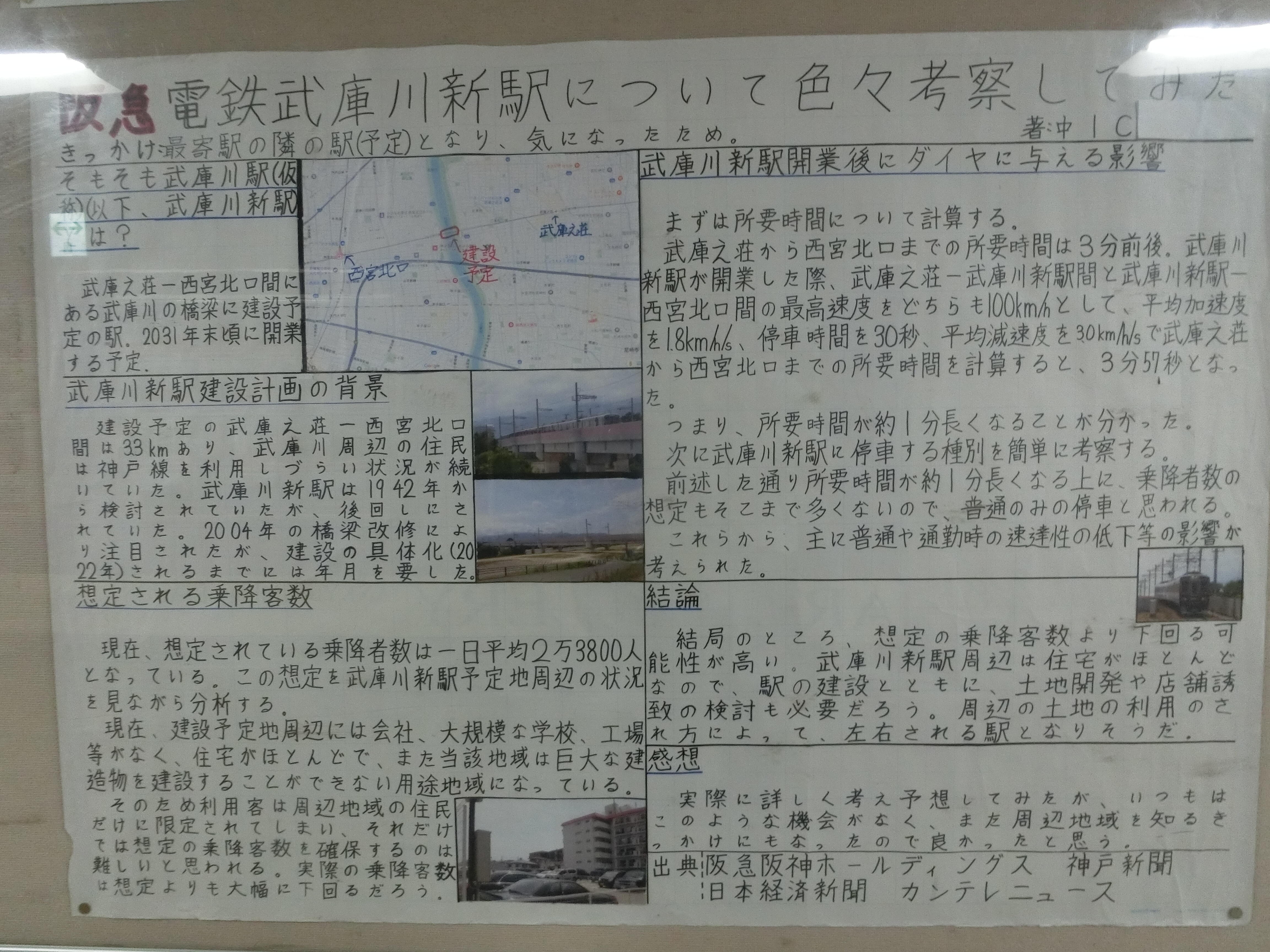 今回は、研究発表の4回目です。8月末に開催した文化祭で展示した研究発表の際、会場で投票をしました。その上位4作品を展示しています。今日はその4位、「阪急電鉄武庫川新駅について色々考察してみた」です。中1の部員が阪急の新駅「武庫川駅」について調べてまとめました。