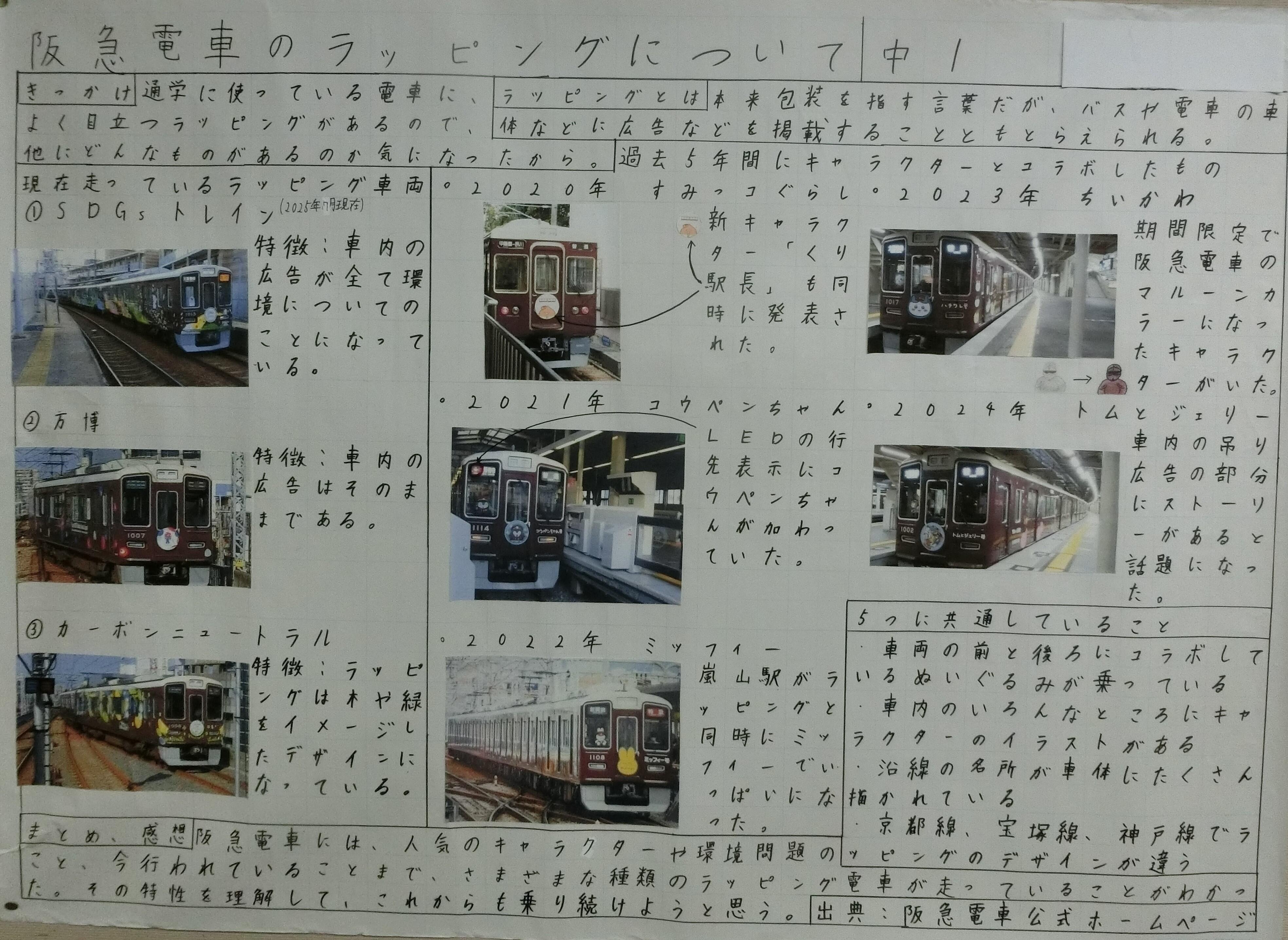今回は、研究発表の2回目です。8月末に開催した文化祭で展示した研究発表の際、会場で投票をしました。その上位4作品を展示しています。今日はその2位、「阪急電車のラッピングについて」です。中1の部員が、ラッピング車両について調べてまとめました。