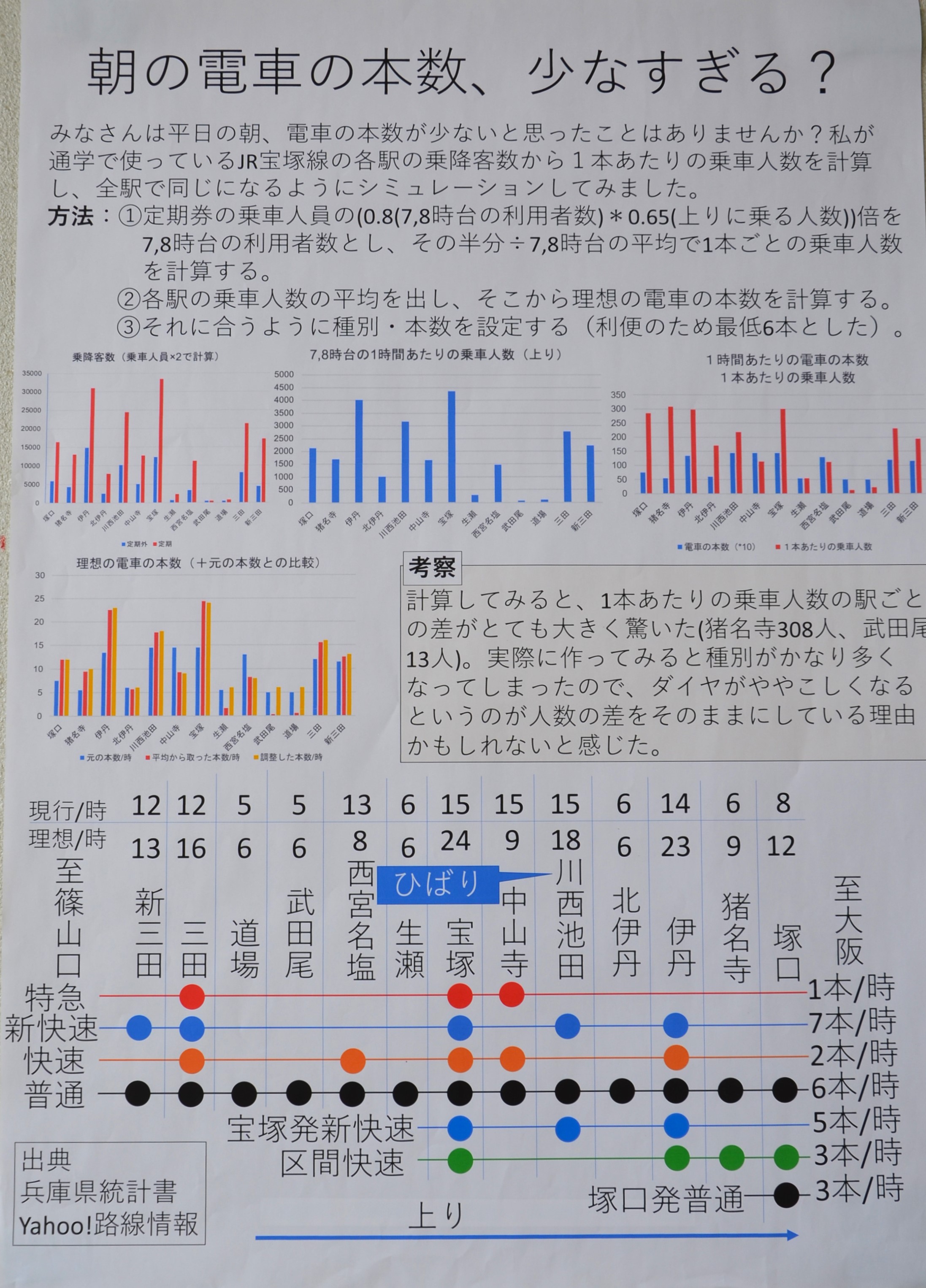 鉄道研究部の部員が、兵庫県統計グラフコンクール第5部(小学生・中学生パソコン統計グラフの部)で「朝の電車の本数、少なすぎる?」というテーマで入選しました。中3の部員が、日ごろ乗車しているJRの各駅乗降客数と本数を分析した作品で、「県統計グラフコンクールのサイト」に掲載されています。技術の授業での取り組みですが、部員として日常の疑問を分析していく大切な取り組みです。