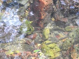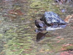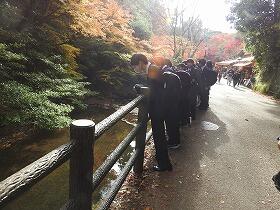 途中の山道では、紅葉がきれいに色づいており、観光客は足を止めて写真を撮ったり見入っていましたが、科学部の部員たちは、川に現れたカワガラスに夢中になり、大きなカワムツを見つけて喜んでいました。
