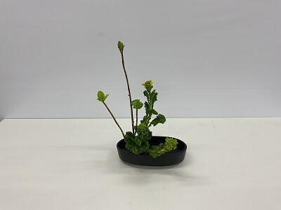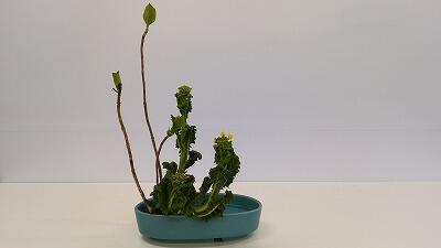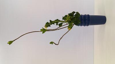 今週の課題のお花は春を感じる「菜の花」と「芽出し紫陽花」でした。それらを瓶花と盛花の直立型でいけました。