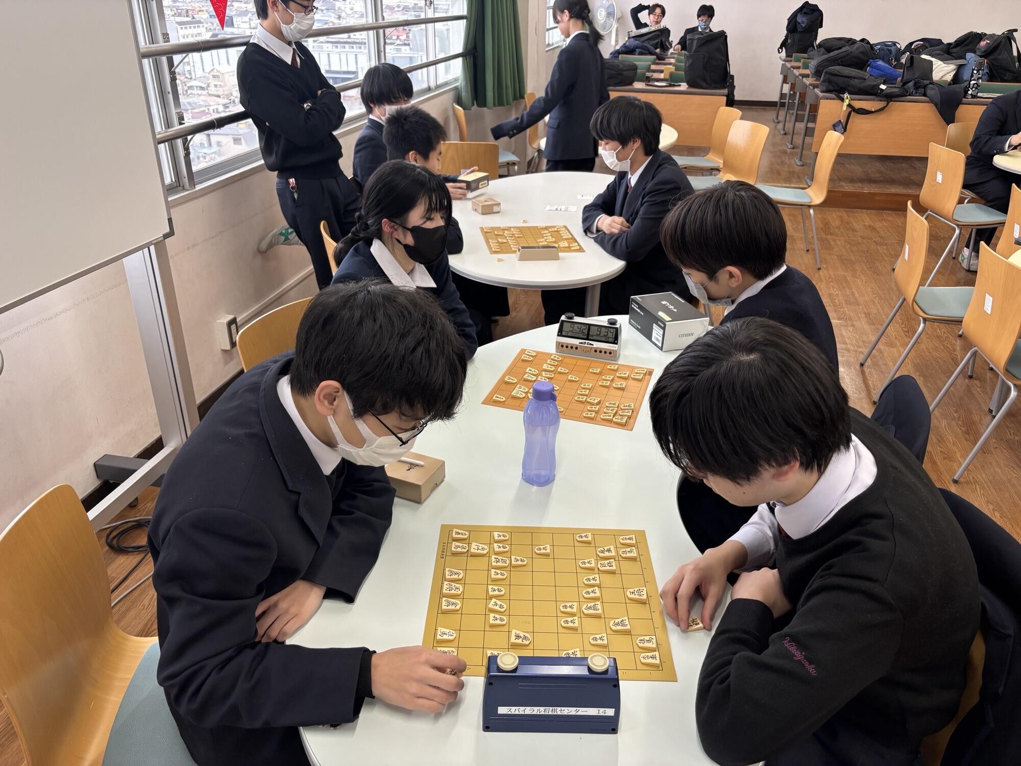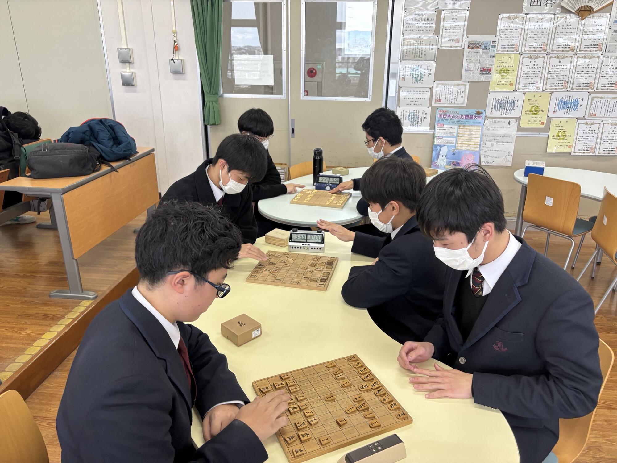 1月31日(土)は初めての取り組みとして部内トーナメント団体戦を行いました。普段実施している部内トーナメントは個人戦ですが、今回は3人1組のチームを作り対局しました。エントリーは6チームで、2ブロック予選に分かれ勝ち抜き2チームで決勝を行いました。優勝は高1三人で組んだチームでした。
