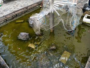 本来の科学部の活動日ではありませんが、講堂前池の水質が悪化し、金魚が病気にかかって次々に死んでいる!という情報があったので、緊急の水替えを行いました。