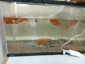 病気で弱った金魚は生物室へ避難して塩水浴、薬浴を行います。良くなってくれるでしょうか・・・