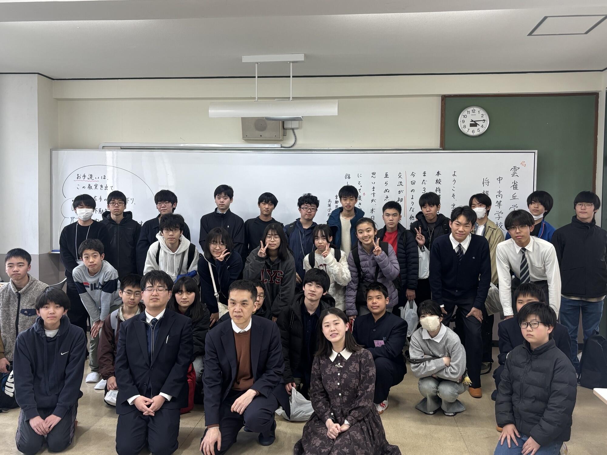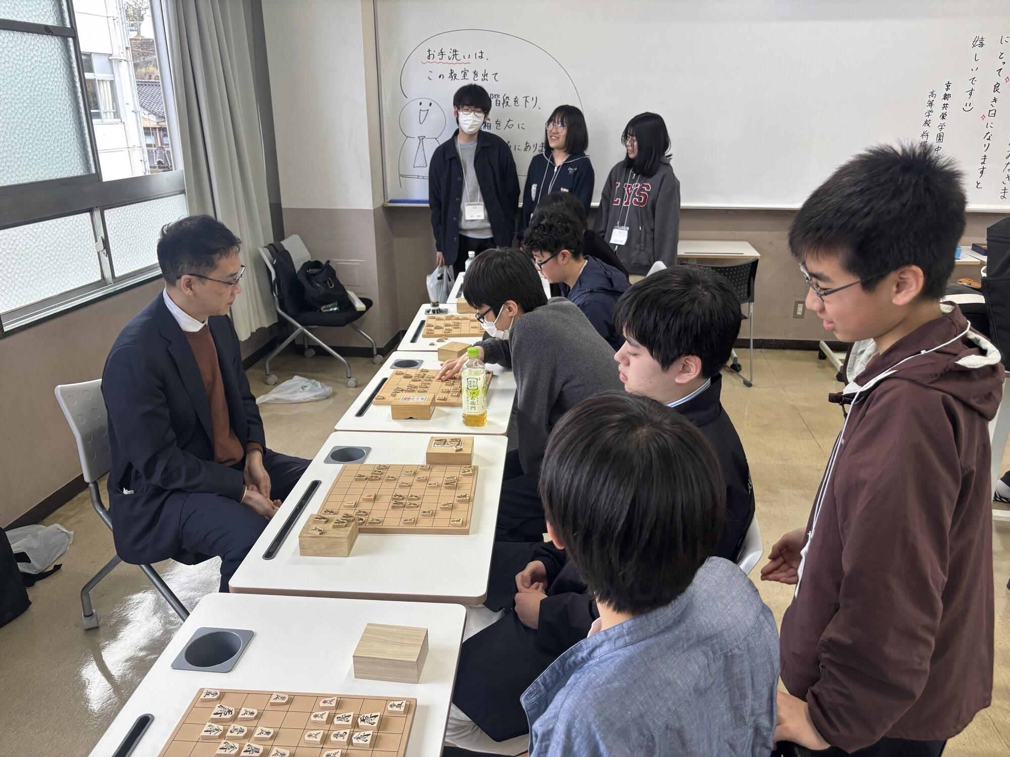 2日目は京都共栄学園中高等学校へお邪魔し、交流会を行いました。京都共栄学園は全国大会出場者や研修会生が多い強豪校です。また、交流会には畠山鎮八段、藤井奈々女流初段、元奨励会三段の麻生様に来ていただき、指導対局もしていただきました。とても豪華な合宿になりました。
