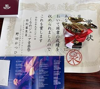 ベースヴォーカルのシンガーソングライターをやってます!今回、くるめジュニア音楽祭のご報告と1stCD持参でお邪魔させていただきました。オリジナル曲でライブをしたりしています。ベースは5弦・フレットなし・ヘッドなしというちょっとかわったものを使っていて、CDの中でどんな風に響いているか是非聞いてみてください!文化祭では4つほどのバンドで屋外ステージで演奏をしていました。将来はもっと有名なアーティストになりたいです。めざせ武道館!!!