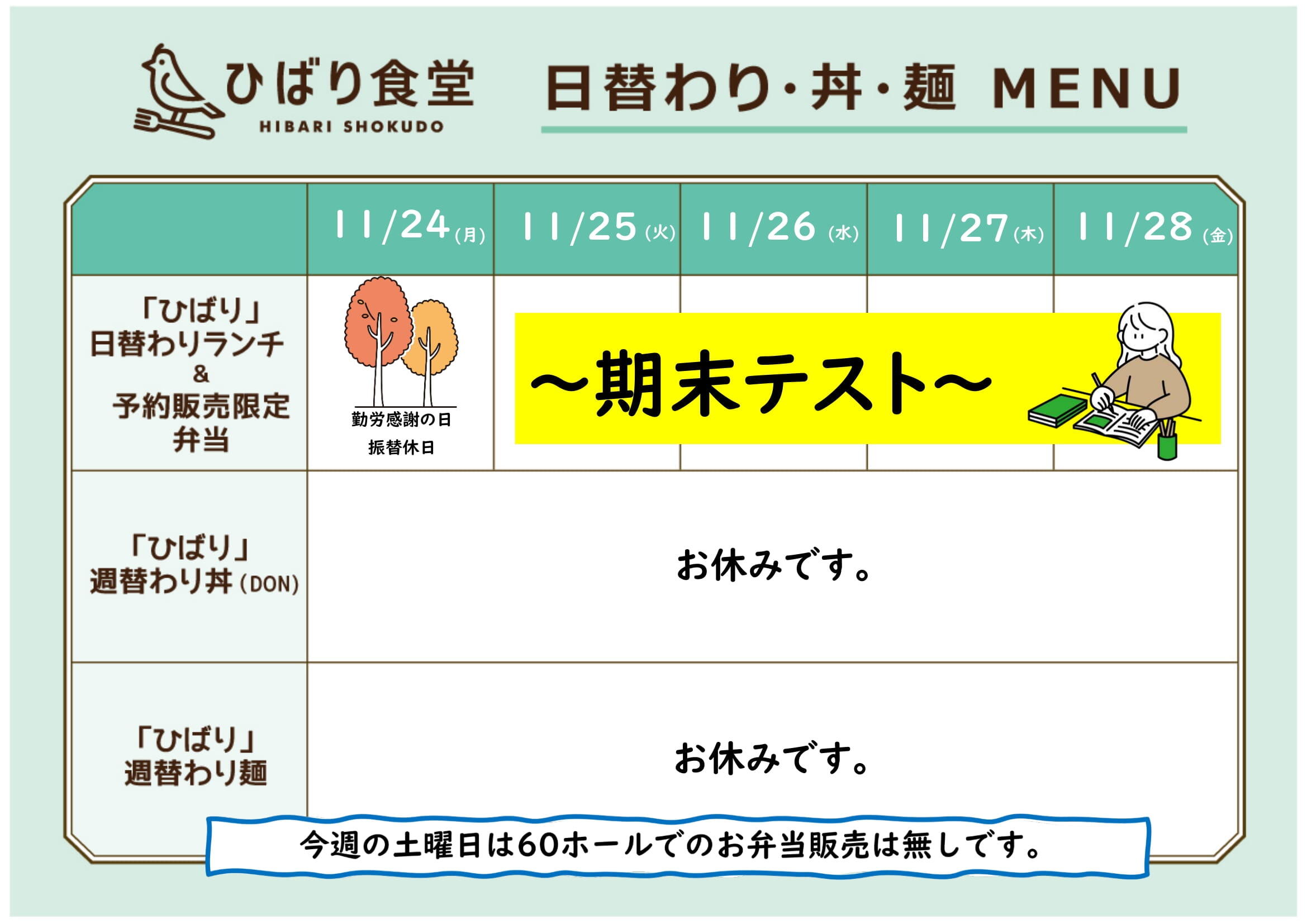 食堂(授業のある月~土の昼営業)では、麺類・カレー・丼・スナックの他、定食を提供しています。