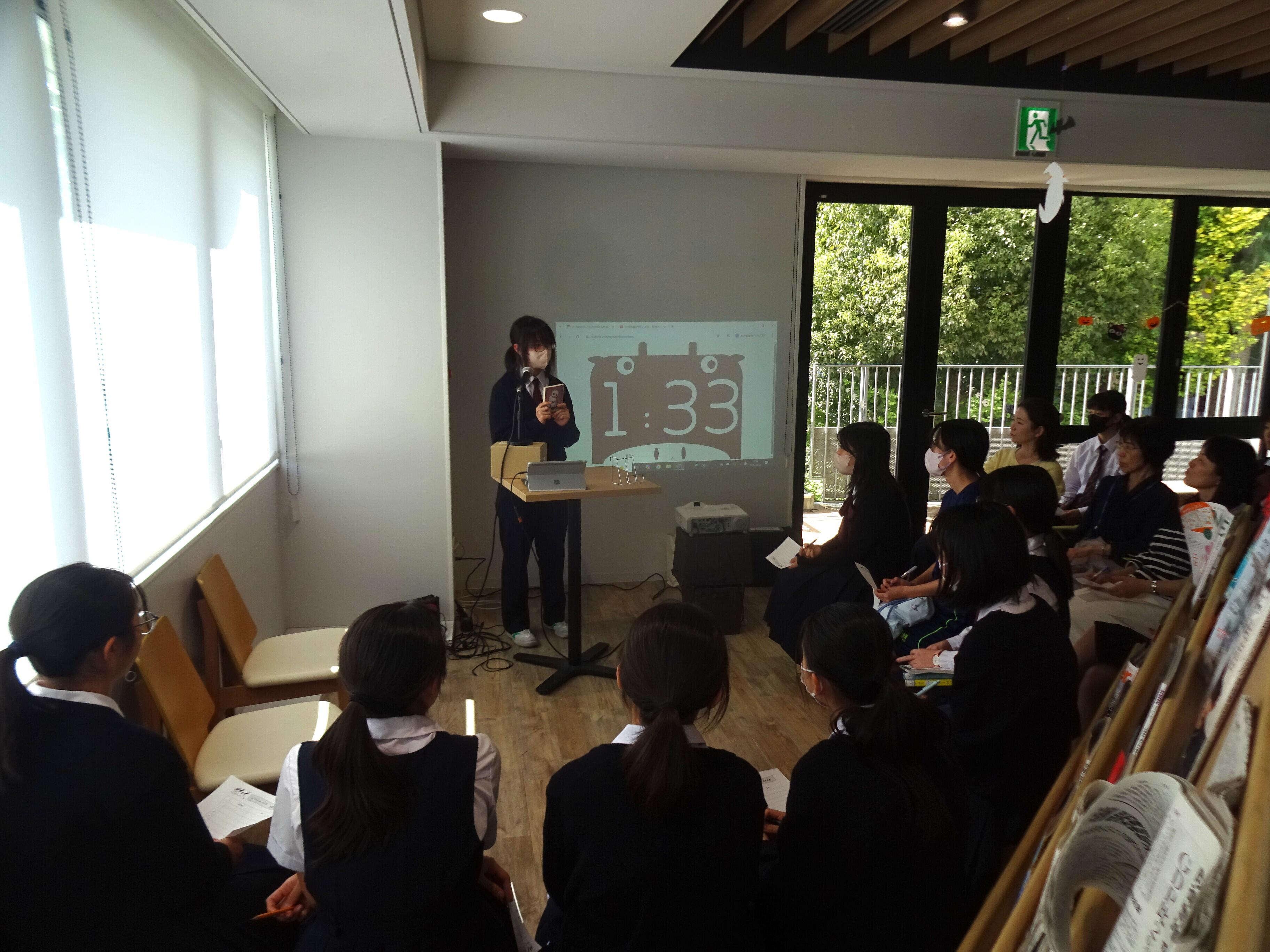 ・・・が、諸事情により2人のうち1人のバトラーが直前に出場キャンセル。急遽、もう1名のバトラーによる発表だけを行うことになりました。場所はいつもの道しるべ図書館、時間は集客をねらってお昼休みとしました。聴衆には生徒だけでなく多くの先生方の姿もありました。ありがとうございました。