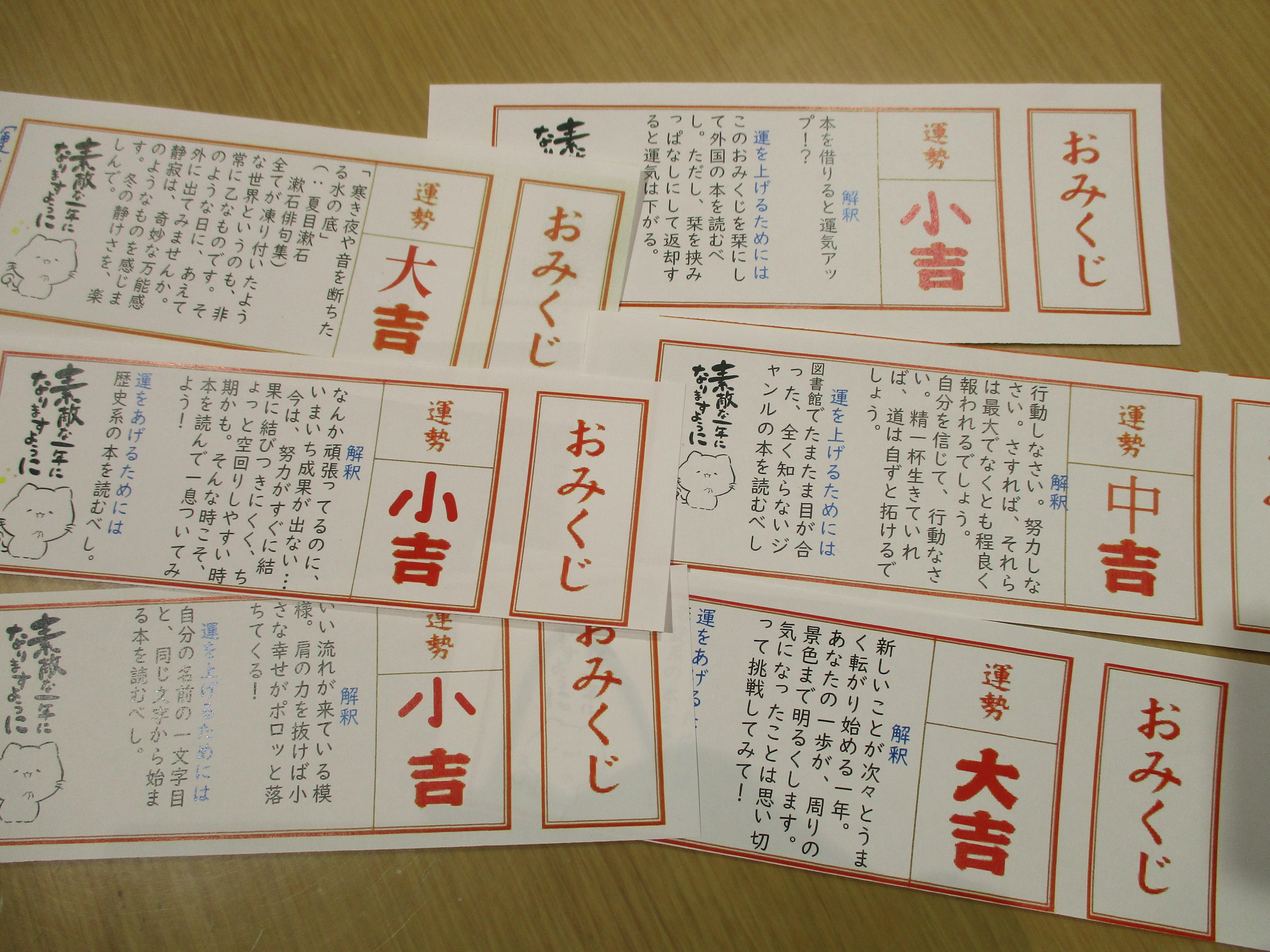 2026年、図書委員会企画のスタートは「本みくじ」です。企画広報部を中心に冬休み前から着々と準備を始めていました。まずは手分けして運勢に合ったおみくじの内容を考えます。中には正岡子規や夏目漱石の作品から引用し自分なりの解釈をつけたものも。そして「本」みくじですから運気アップのためのおすすめ本ももれなく提案しています。例えば・・・