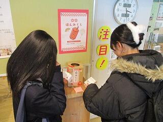 60ホール前のおみくじには登下校時にたくさんの人が手を伸ばしています。運勢だけじゃなく、おすすめ本のアドバイスもみてくださいね・・・。