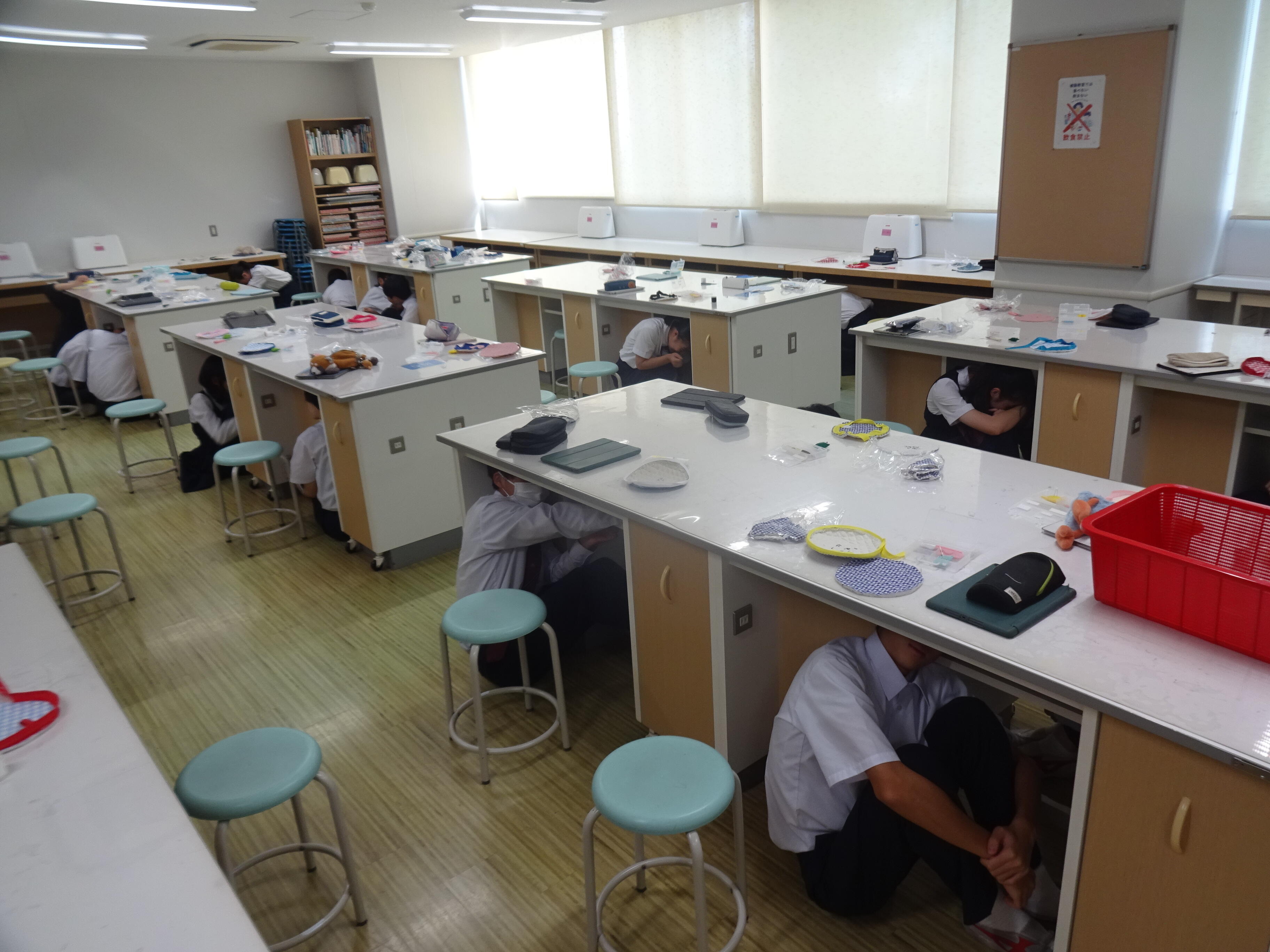 あるクラスでは被服教室での裁縫中に訓練が始まりました。みんな必死で机の下に隠れていました。すっかり大きくなった中3の生徒たちは「体が入らない~」と言っていましたが、本当の災害のときはそうも言っていられません。自分の身は自分で守るのです。避難後、校長先生からは「とっさのときに身を守ることが出来る人は普段から想像力を働かせている人です」「京都大学の先生によると、南海トラフ地震は2030年代には必ず起きると言われています」というお話がありました。どちらも大切なお話です。心に留めておいてください。