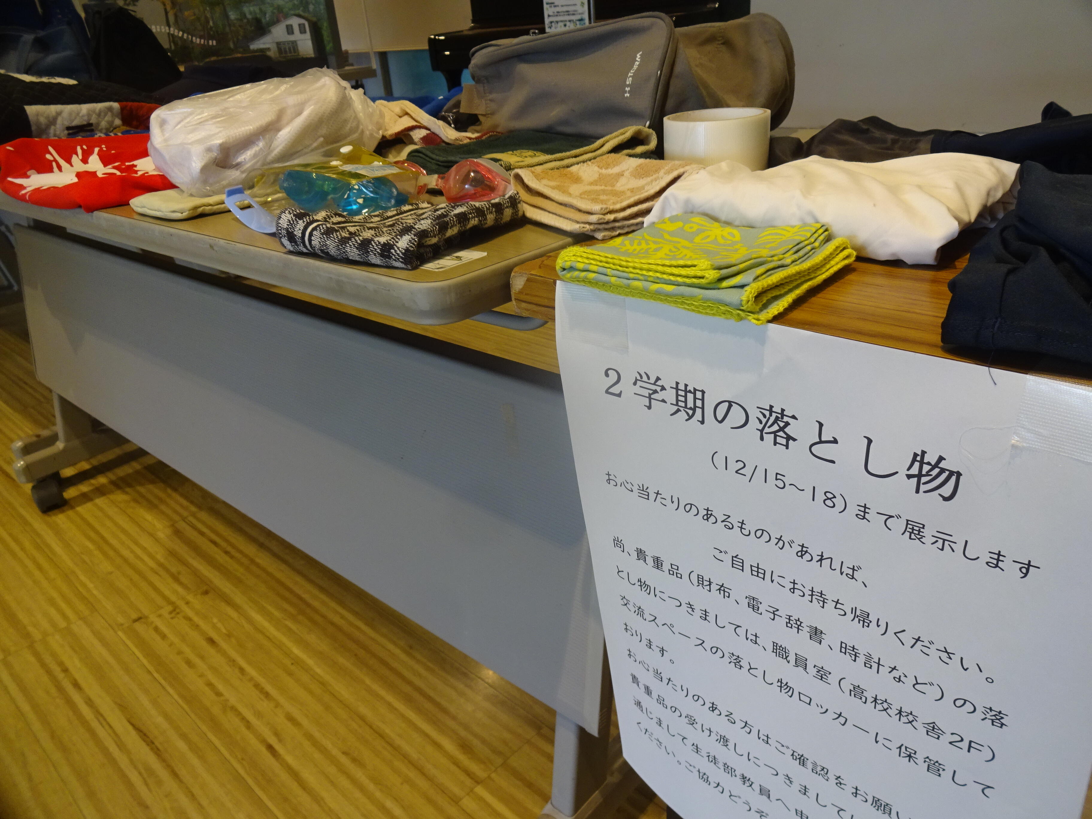 60ホール前に「2学期の落とし物」展示中。信じられないことですが、コートまで忘れられています。
