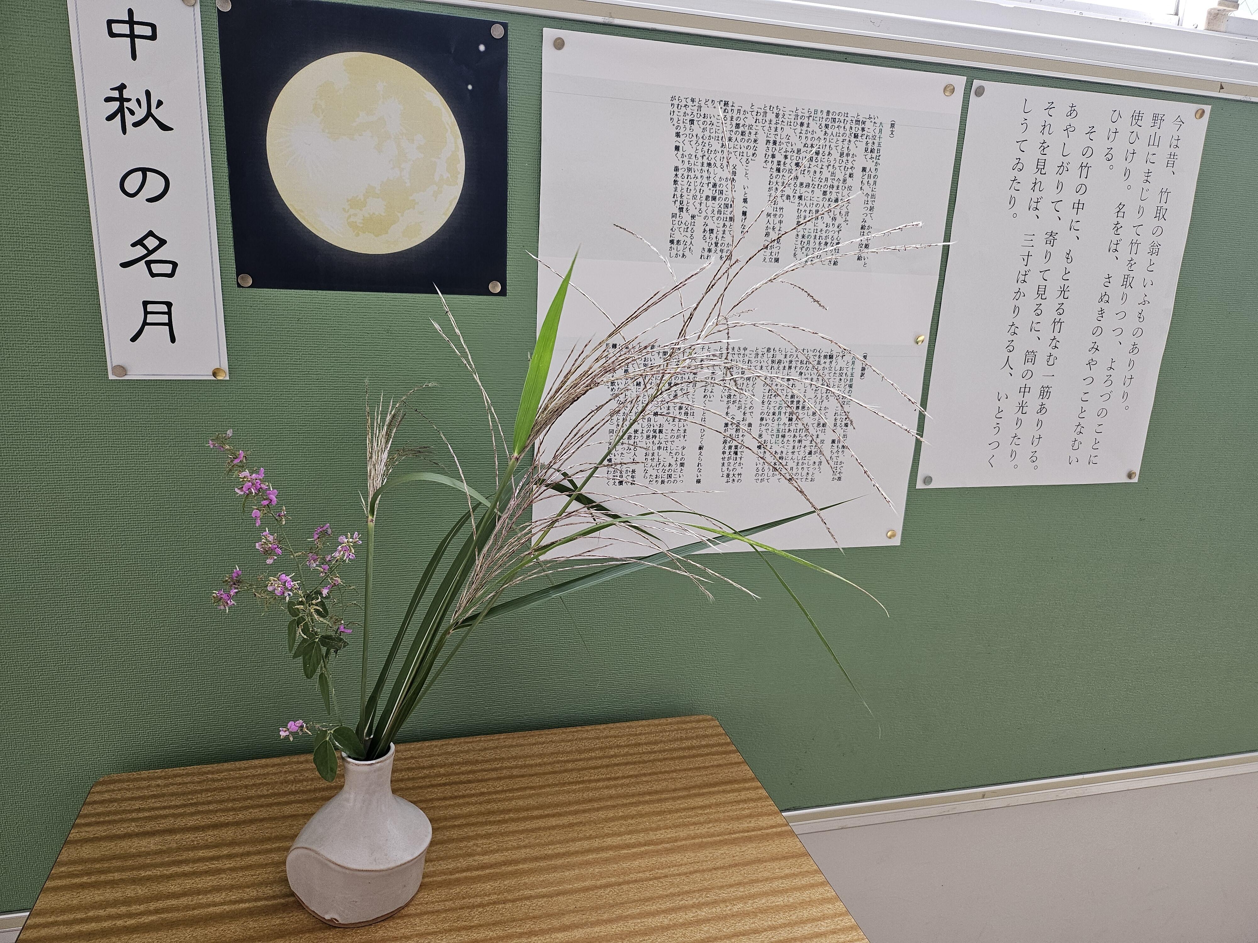 国語の授業では「竹取物語」をしています。かぐや姫に月からのお迎えがやって来るのが「八月十五夜」、つまり中秋の名月です。
