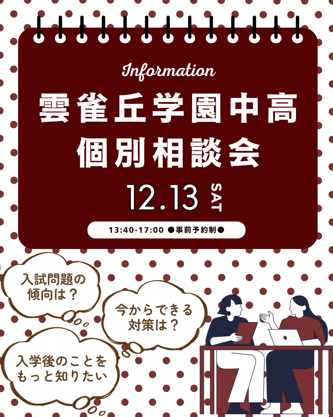 雲雀丘学園中学校・高等学校 English 学校案内 学校長挨拶 運営方針 施設紹介 交通アクセス 教育内容・進路 学習計画 実践的教育 合格実績 キャリア教育 学園生活 学生の一日 行事予定 年間行事 クラブ活動 入試情報 最新入試情報一覧 中・高パンフレット 中学入試 高校入試 学校説明会・公開行事 転入考査 よくある質問 各種手続き 在校生に関する手続き 卒業生に関する手続き アクセス 資料請求 English 最新入試情報 個別相談会2026.12.13 今年も、個別相談会を行います! お申し込みは 12月1日から受付開始です! こちら からどうぞ! 入試情報 最新入試情報 中・高パンフレット 中学入試 高校入試 入試関連イベント 転入考査 よくある質問 トップページ 入試情報