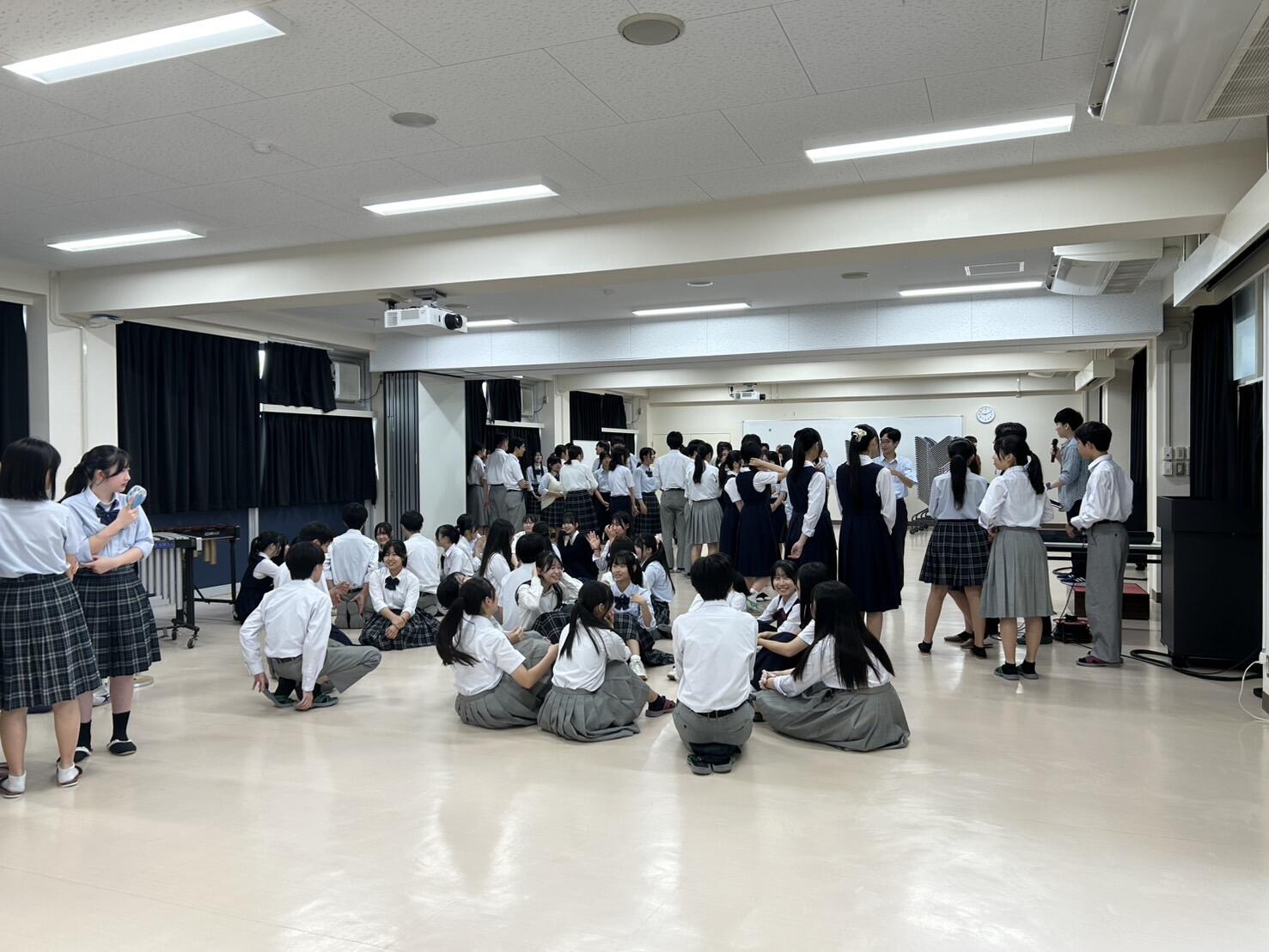 本日は5校合同練習を行なっています。毎年宝塚市内の高校で合同の演奏会を行っており、そこで演奏する合同曲の練習です。今日は初回練習でしたので、実行委員の紹介と各パート内での自己紹介から始まりました。合同演奏は宝塚らしく宙組と花組の2チームに分かれます。普段一緒に練習しない人と隣り合って音を出すので大きな刺激になっています。これからも毎月練習があります。ぜひ色々な音を聞いて経験値を積んでほしいと思っています。