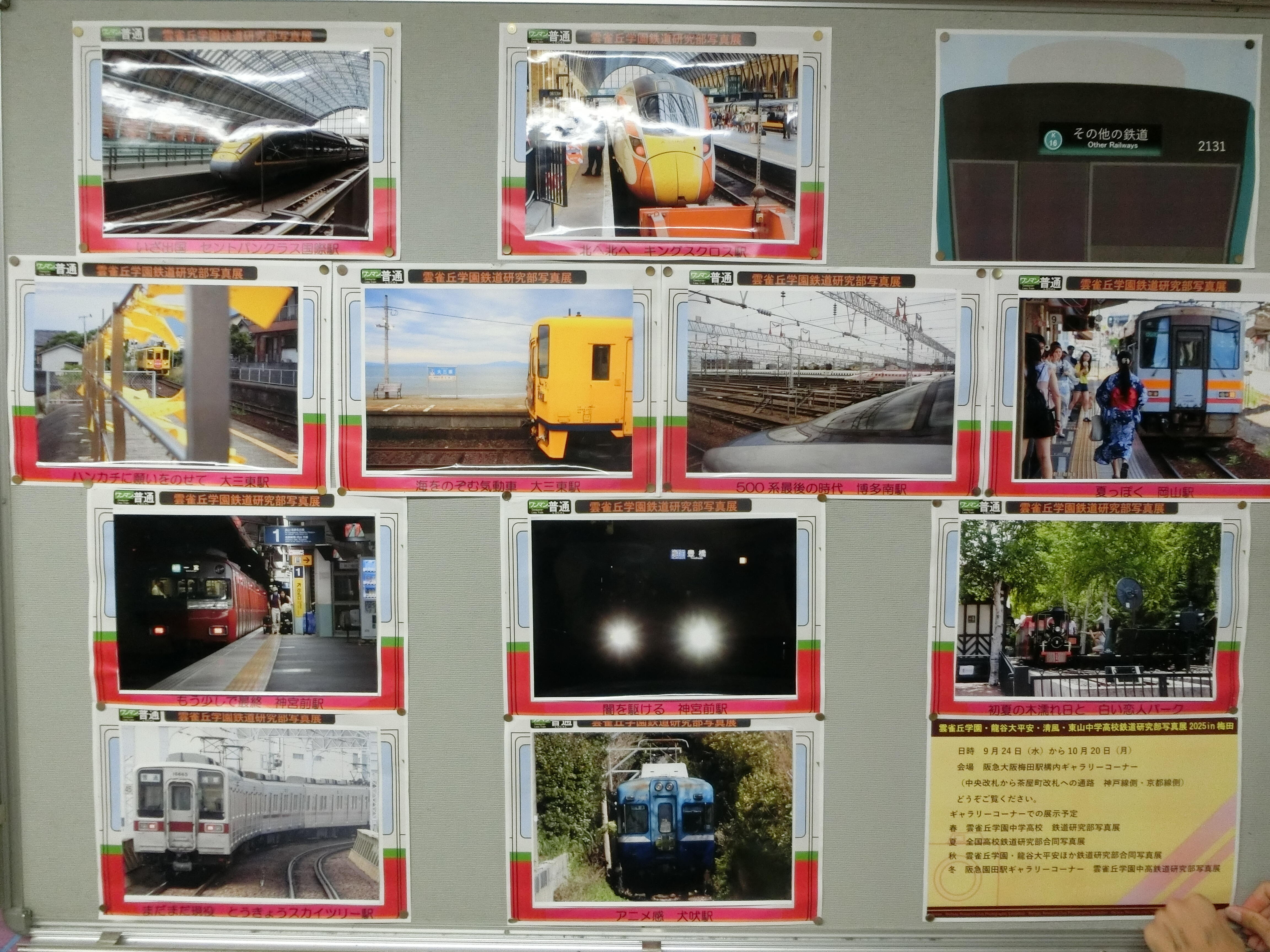 鉄道研究部は、9/24~10/20に、阪急大阪梅田駅構内ギャラリーコーナー(中央改札と茶屋町改札との連絡通路上)にて、雲雀丘学園・龍谷大平安・清風・東山鉄道研究部合同写真展を開催しています。展示場所は、雲雀丘学園と清風が神戸線下、龍谷大平安と東山が京都線下の通路です。写真展について阪急電鉄のwebサイト「阪急沿線おしらべ係(こちらをクリック)」に掲載されています。