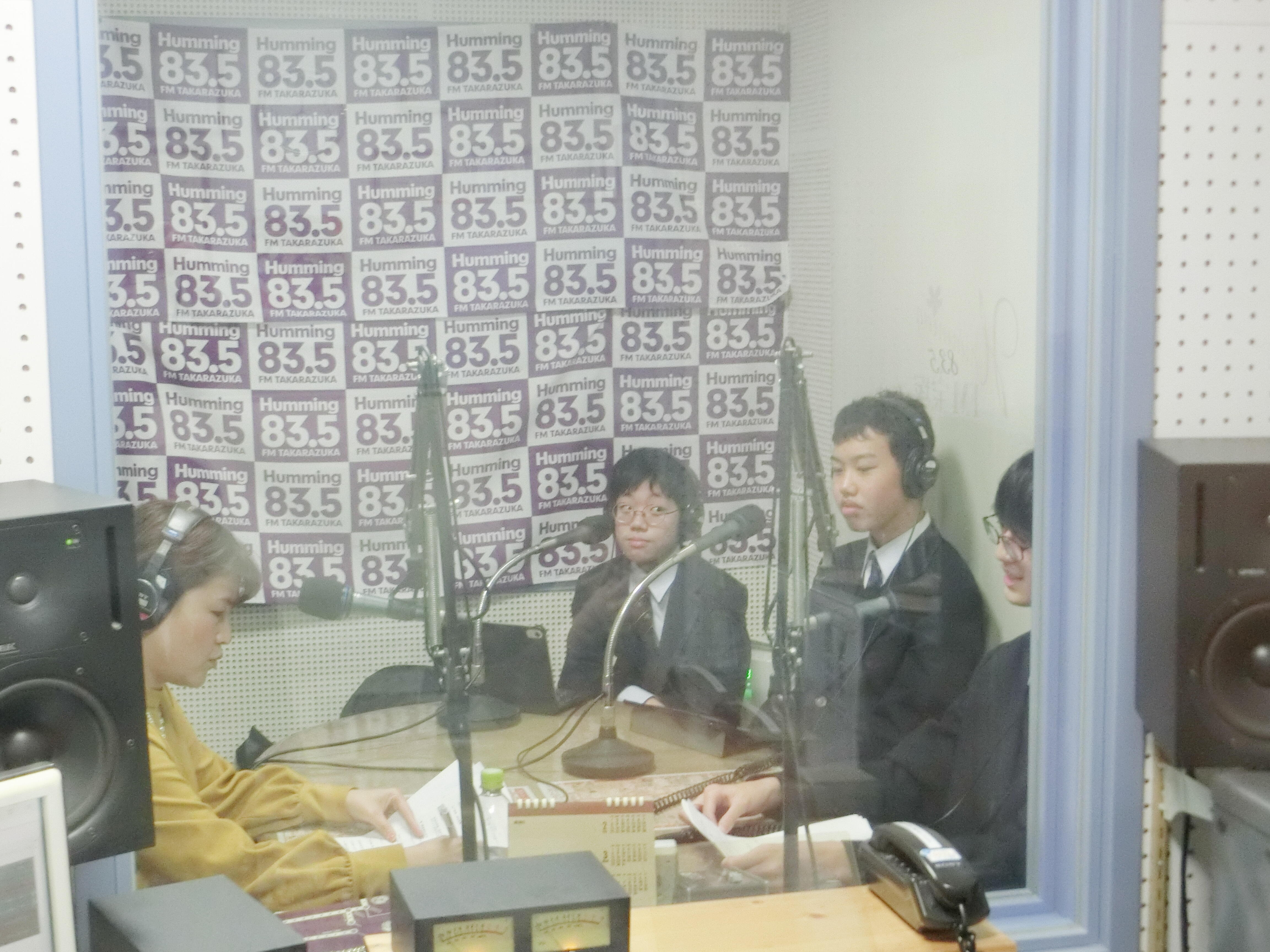 開局25周年を記念し、鉄道とのつながりを考えることで宝塚の魅力を伝える特別番組『タカラヅカ☆トレイン(仮)』の中の「宝塚トレイン歴史探検隊」として、「雲雀丘花屋敷の謎」「宝塚は、なぜ終点になったのか」「宝塚から梅田までのルート」という3つのテーマでトークしました。阪急の前身である「箕面有馬電気軌道」で終点になるはずだった有馬温泉まで部員がバスで乗車した車内音や、阪急宝塚駅の2種類の発車メロディー・学園の専用通路で聞いた発車音を録音し、音源として持参し、高2→1名、高1→1名、中3→1名、中1→3名の計6名がスタジオでトークしました。現場音の収録は、トーク以外の部員も協力しました。