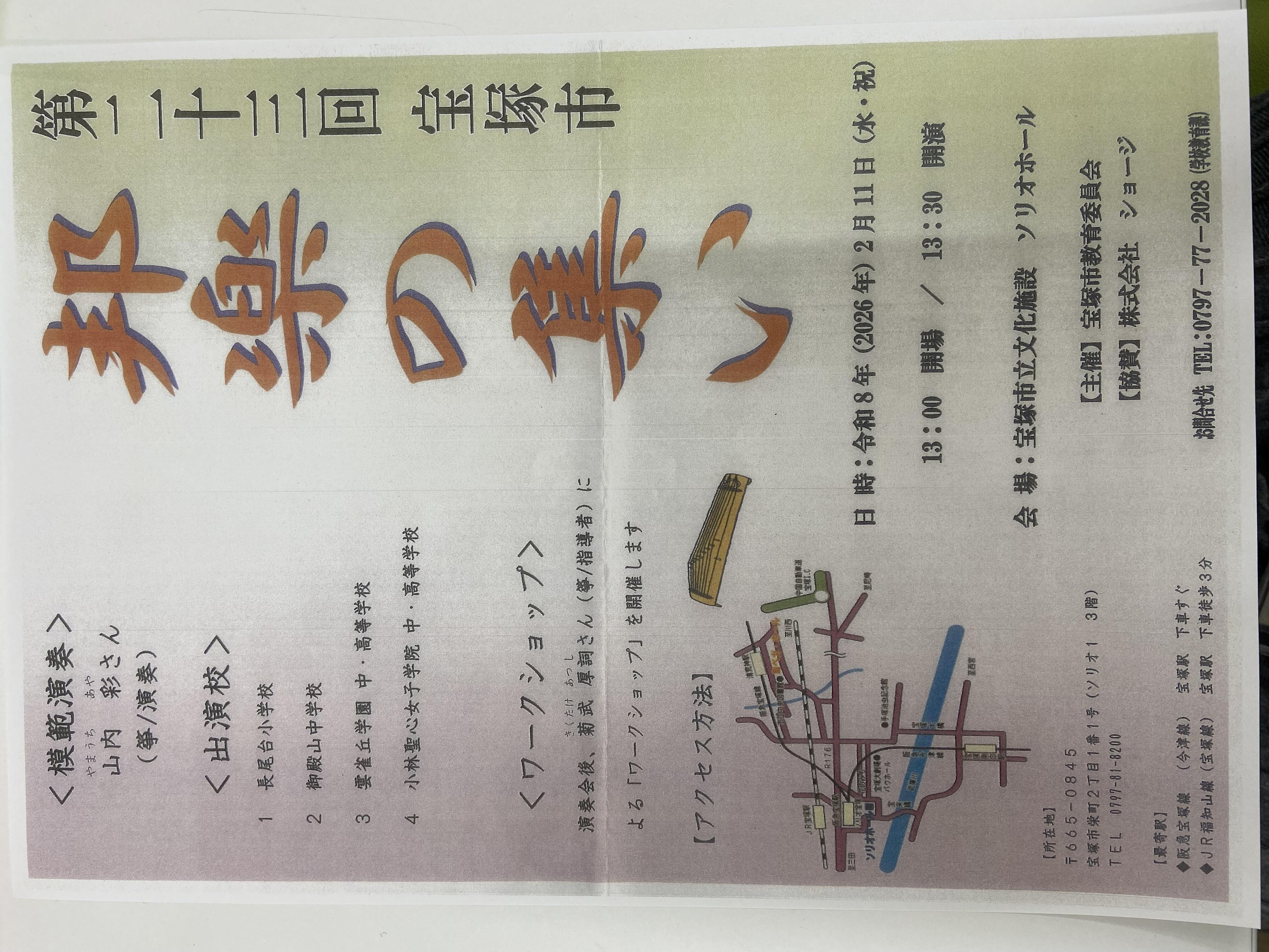 来る2月11日(水・祝)、宝塚ソリオホールにて行われる「邦楽の集い」に、本校の箏曲部が出演いたします。