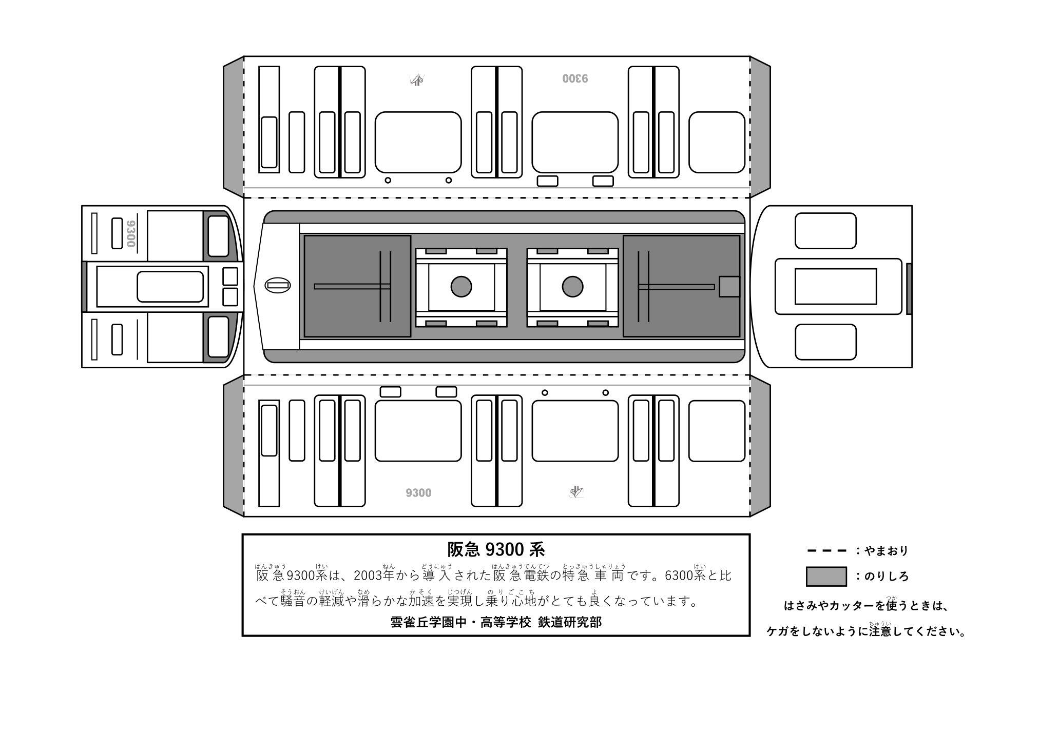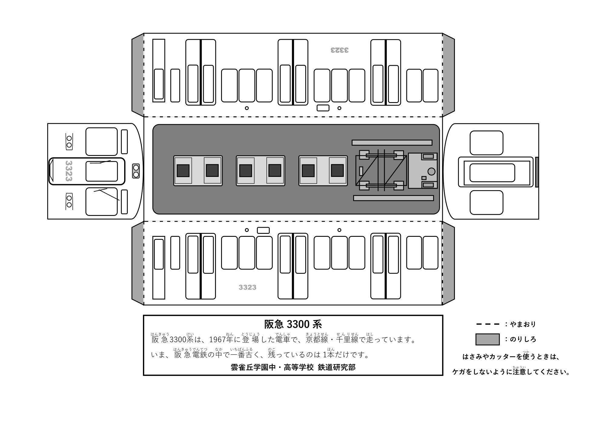 鉄道研究部は、プラレールにかぶせられる大きさで、ペーパークラフトを製作しています。3/22に校外イベントがあるため、新作ペーパークラフトをつくりました。「阪急3300系(クリックすれば拡大)」と「阪急9300系(クリックすれば拡大)」です。数に限りがあるので、ご了承願います。