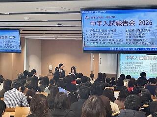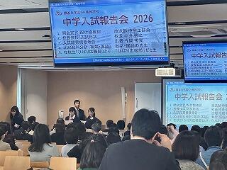 雲雀丘学園中学校の今年度の入試について振り返る、「中学入試入試報告会2026」において、中2の部員3名と中1の部員1名が司会を務めました。