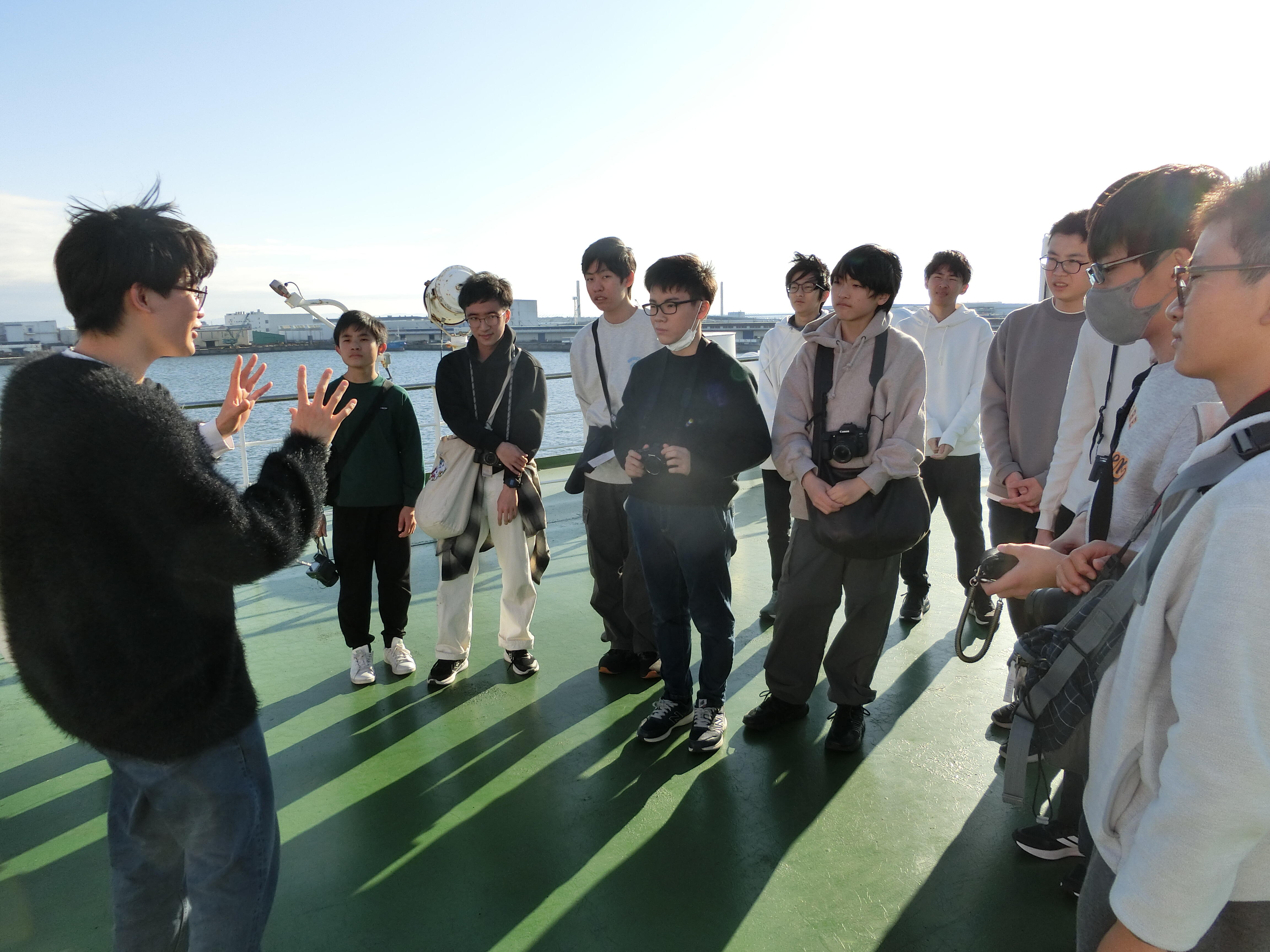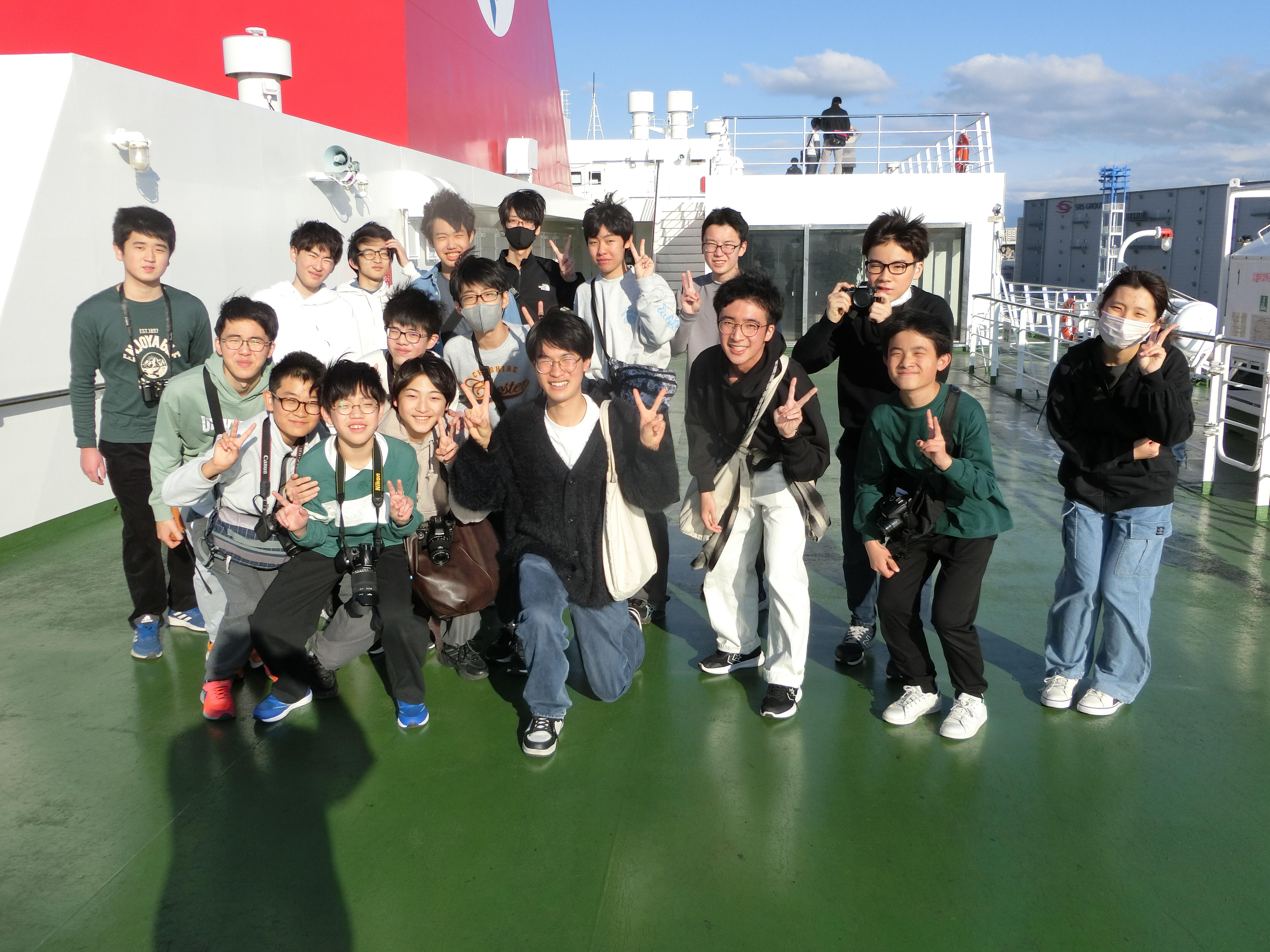また、船中で67期の卒業生が声をかけてくれました。鉄道研究部ではありませんが、顧問に声をかけ、部員に話をしてくれました。京都大学居合道部の合宿で乗船していたそうです。偶然の出会いに、部員たちも喜んでいました(3・4枚目)。
