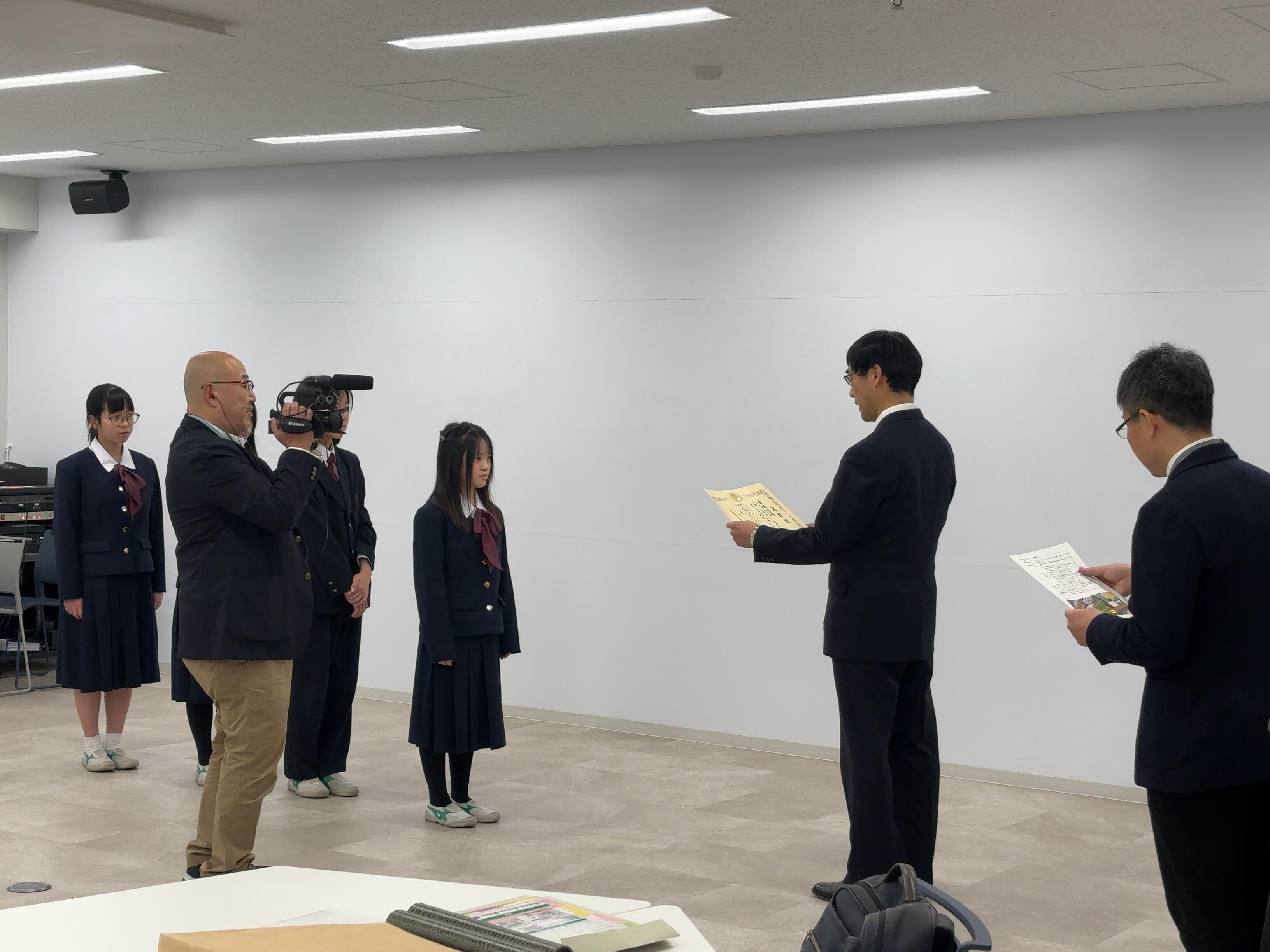 「動画フェスタ2025」というコンテストにおいて、放送部中学2年生チームの作品が「最優秀賞」を中学1年生チームの作品が「優秀賞」を受賞し、昨日本校にて表彰式がありました。