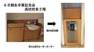 卒業式で目録披露があった68期生卒業記念品「ボトル式ウーターサーバー」を寄贈いただきました。熱中症対策として高校校舎2階に設置いたします。ありがとうございました。卒業生のみなさんもお水を飲みに来てください!