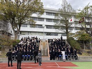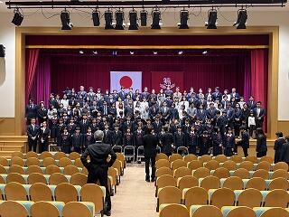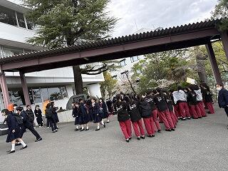 生徒会の歓迎の言葉、吹奏楽部の演奏も行われました。中学写真撮影は荒天のため、講堂内で行いました。