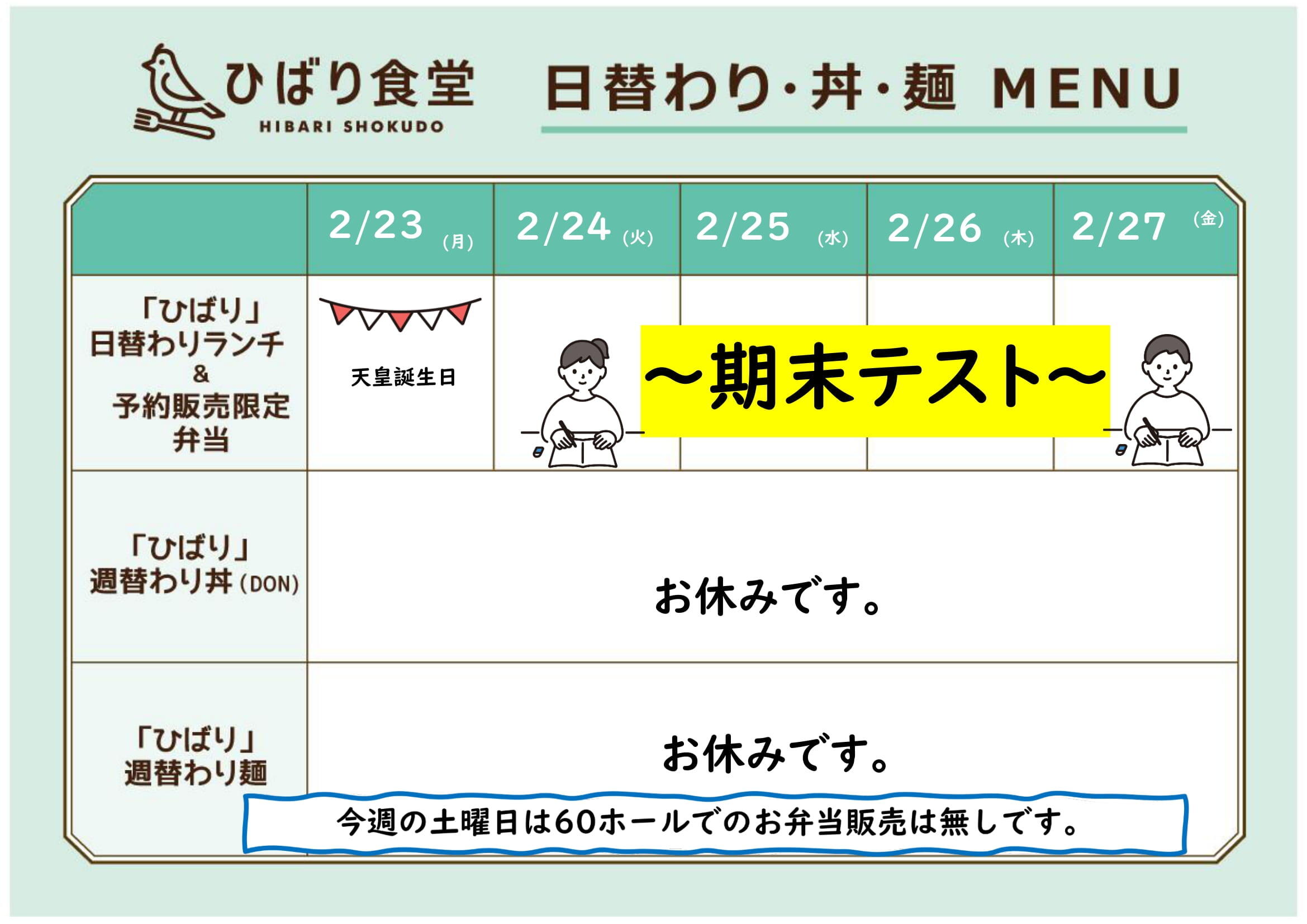 食堂(授業のある月~土の昼営業)では、麺類・カレー・丼・スナックの他、定食を提供しています。