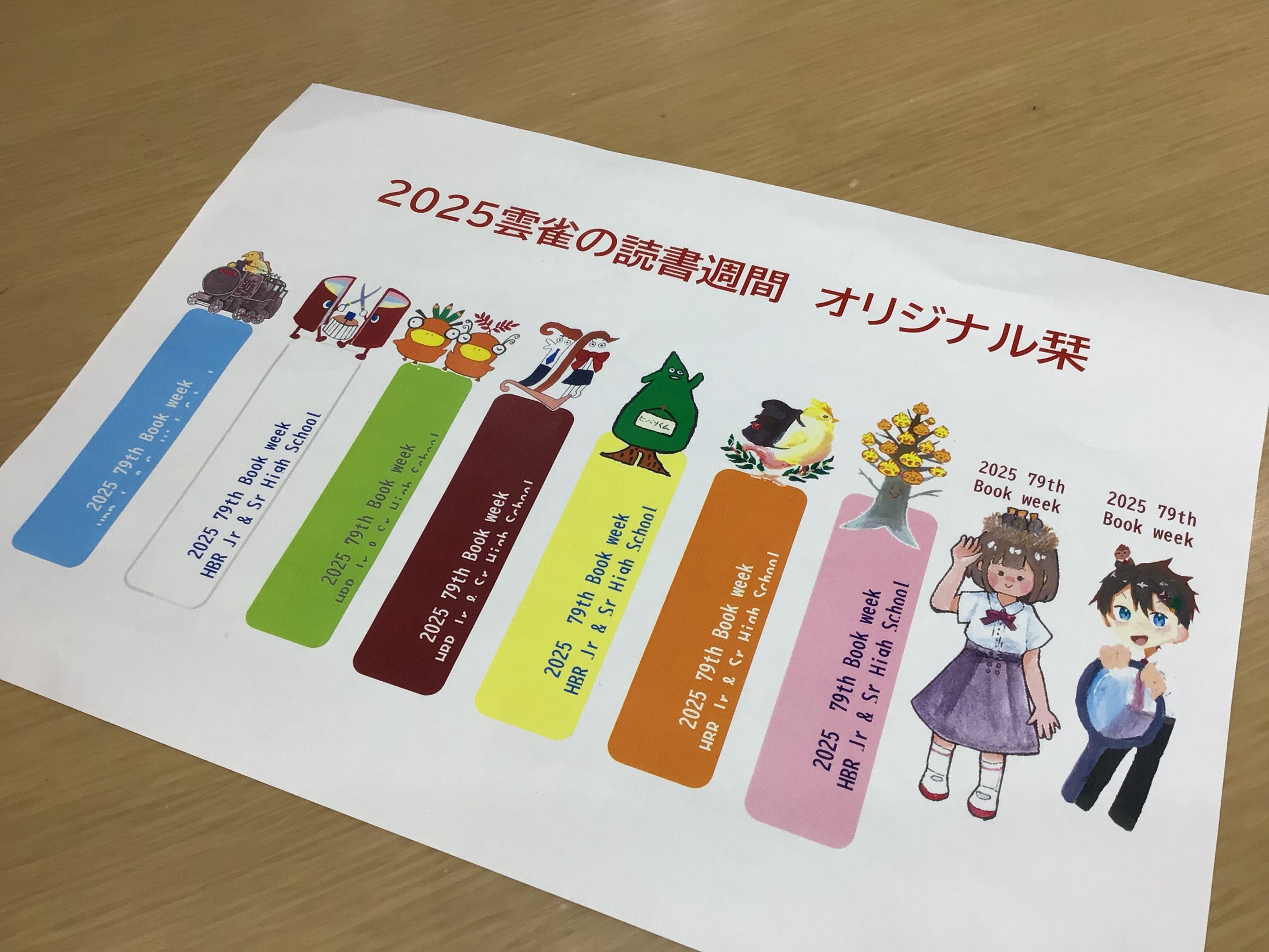 昨日から廊下に「71期生が考える雲雀のオリジナルキャラクター」が掲示されています。(10/2ブログ参照)美術の授業で一人ひとりが考えて、自分の手で描き、色塗をしました。みんなの作品の中から、図書館の司書の先生が見て気に入った作品を現在図書館で開催中の読書週間において、景品の栞のイラストとして使わせてもらっています。