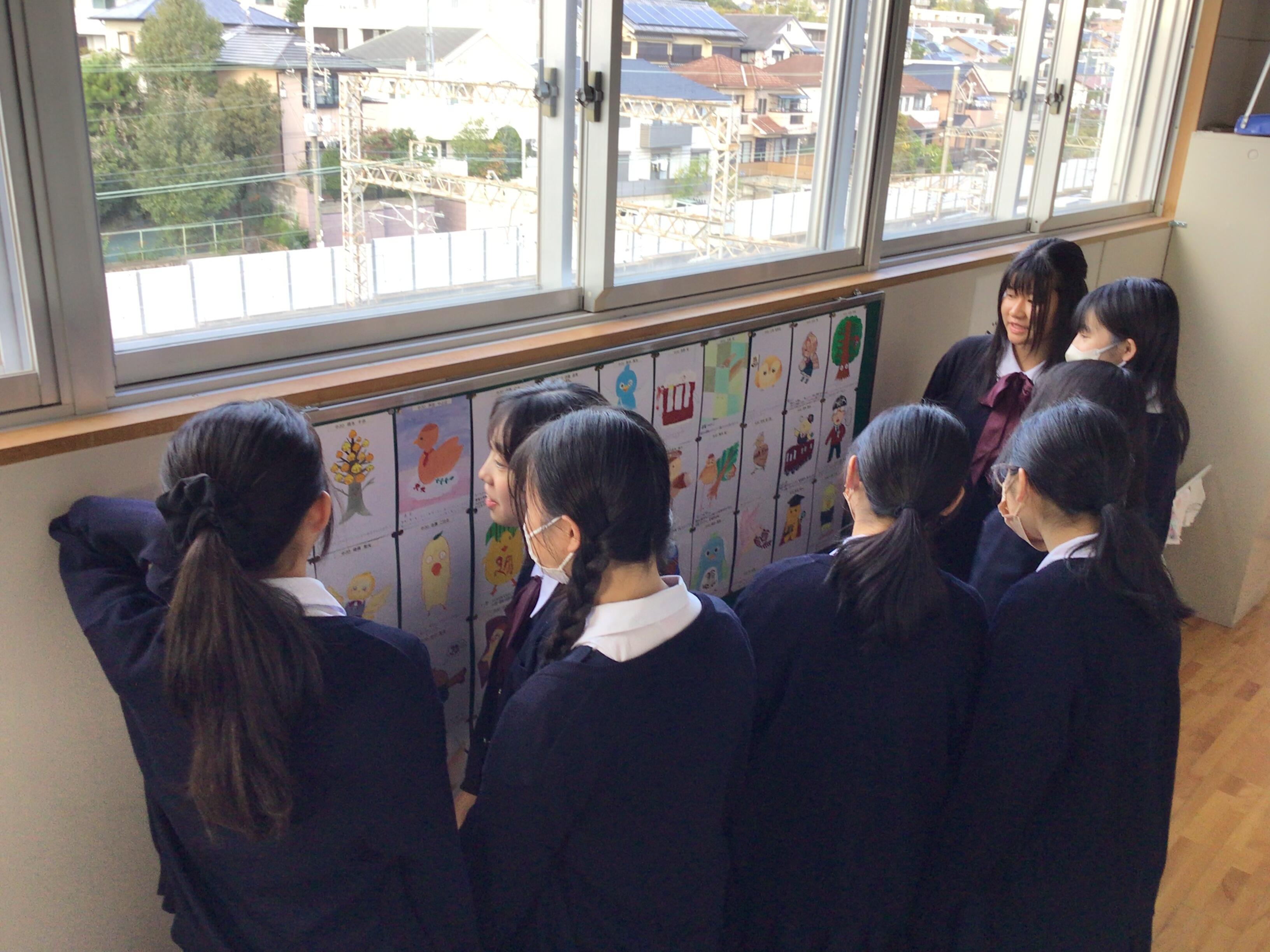 張り出された直後にはどのクラスの前にも人だかりができて「かわい~」「うまっ」「おもろー」とみんなで見合っていました。本当によく考えられていて、見ていて飽きません。保護者の皆様も11/13(木)の授業参観時にどうぞご覧ください。