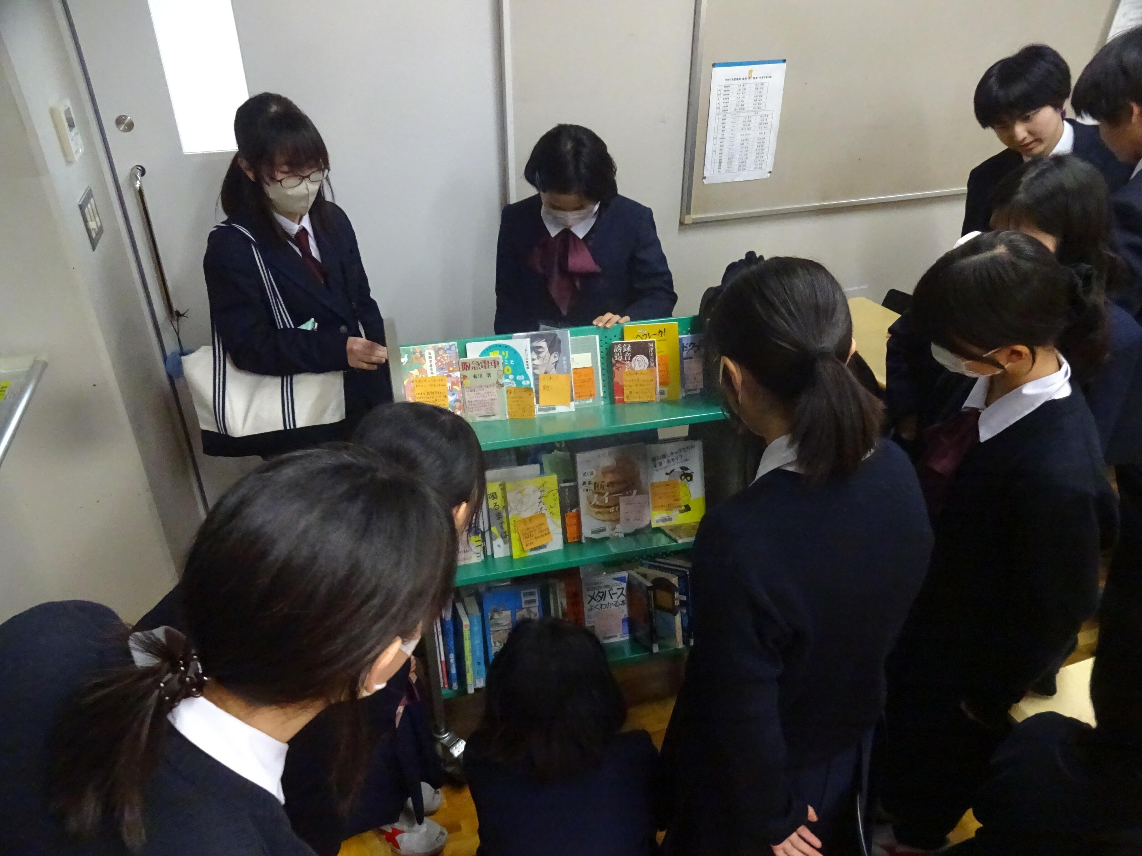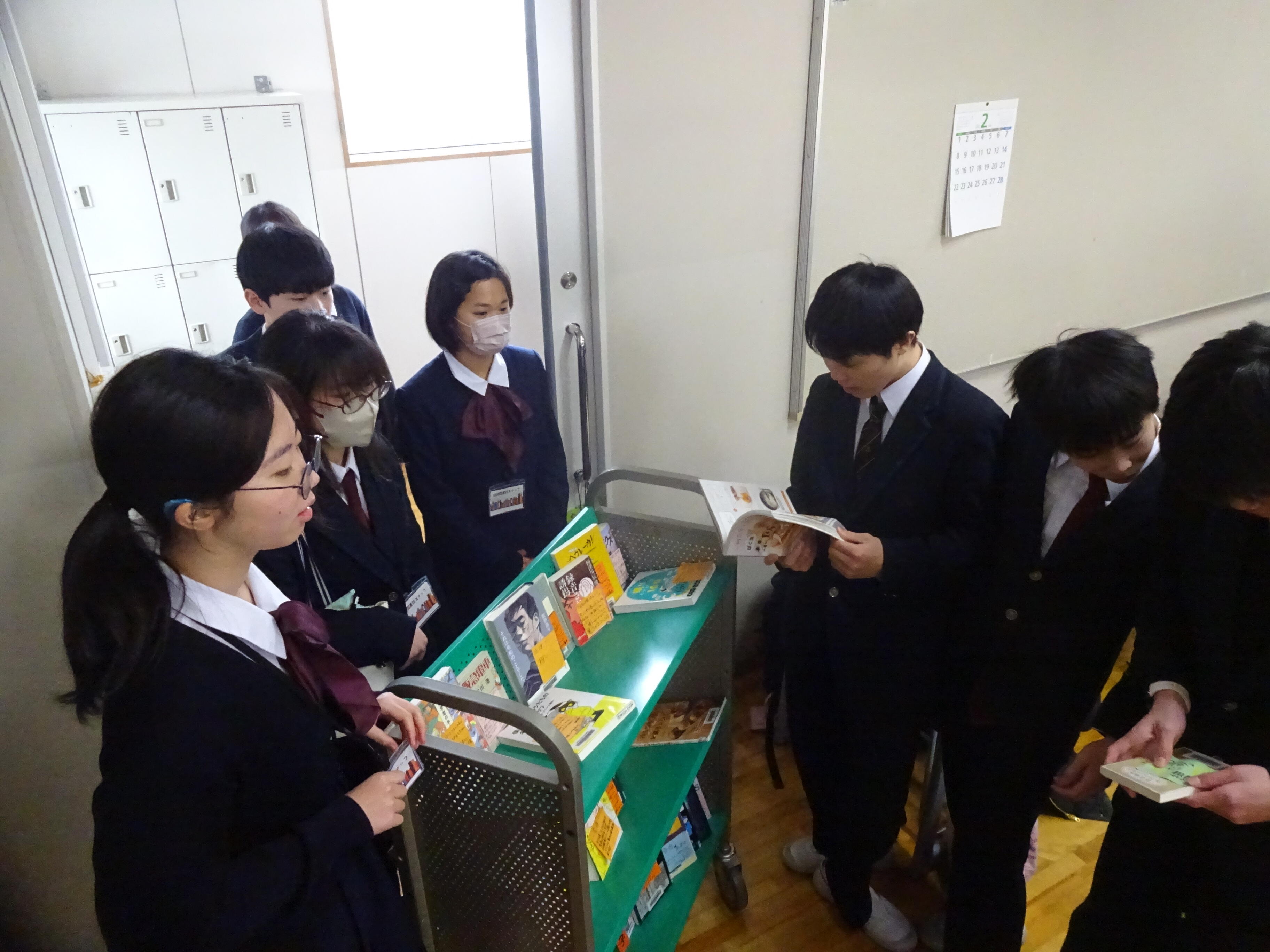 先日「移動図書館」が中3の教室にやってきました。これは図書委員が図書館をもっと身近に感じてもらおうという意図で企画しました。昼休みに図書委員たちが「本借りませんか~?」と各教室を回ります。中3の図書委員が中心となって宣伝していることもあり、けっこうな人だかりができました。2月14日が近いせいか、バレンタイン関連本に惹かれた人も。テスト勉強ももちろん大事ですが、今の時期にしか読めない本があります。今しかできない読書体験が間違いなくあります。