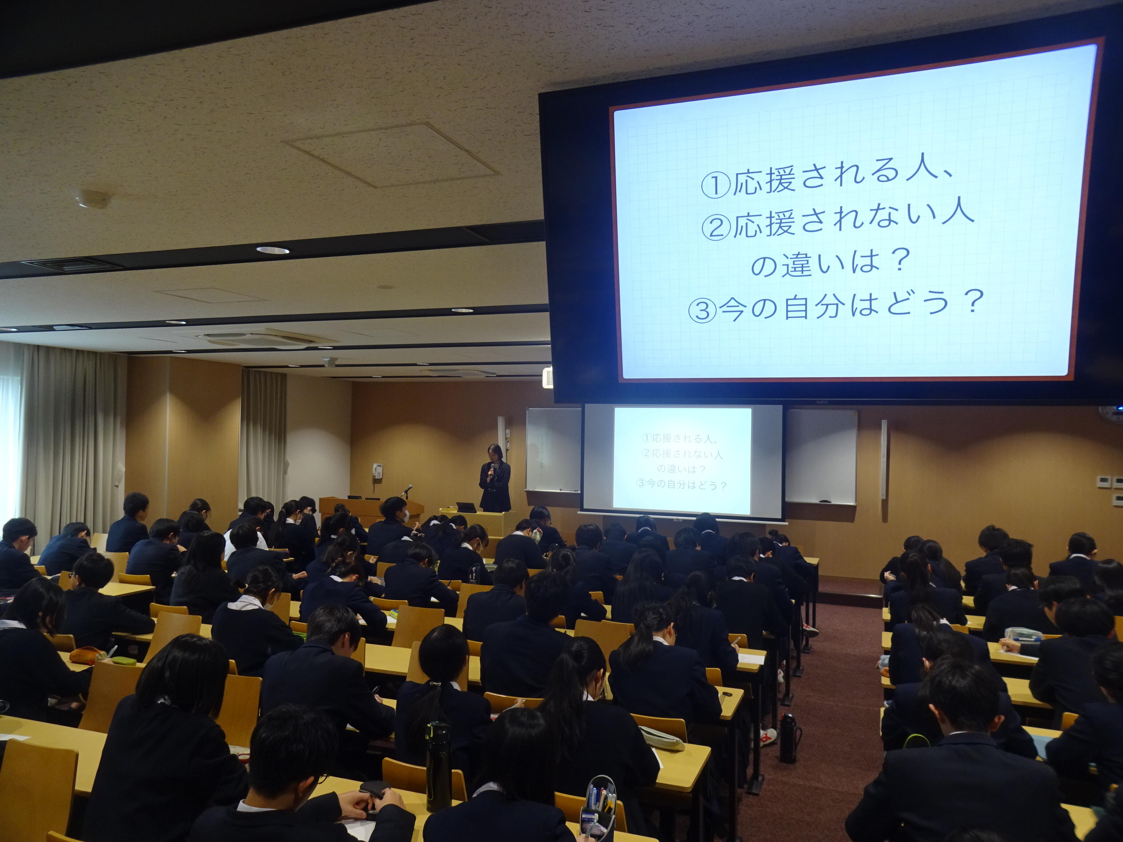 7時間目の道徳はS先生による「応援される人になろう」です。人間誰でも間違いやミスを犯します。その時にどのような言動をとればよいのか。そして次からはどうするのか。先生はご自身のこれまでの体験をもとに「信頼を得ることは自由を得ることである」と仰っていました。これは皆さんに本当に大切にしてほしい言葉です。言い換えれば、自由を得るためには信頼を得なければならないということです。今の自分が不自由なのを他人のせいにしていませんか? 大人の社会では自らの力で信頼を得てこそ、その人に自由が与えられます。高校からの皆さん、ではなく、明日の朝からの皆さんの行動に期待しています。