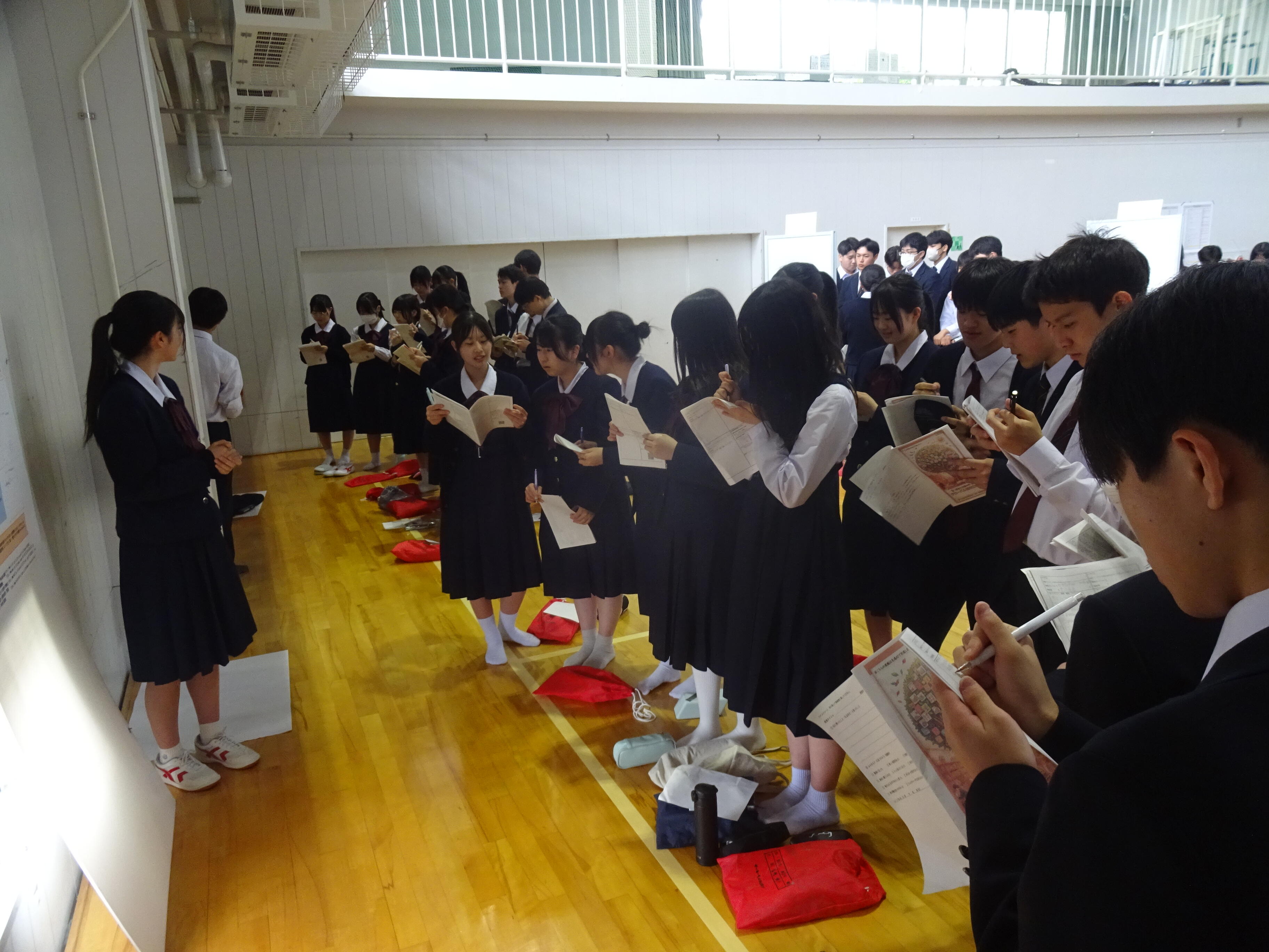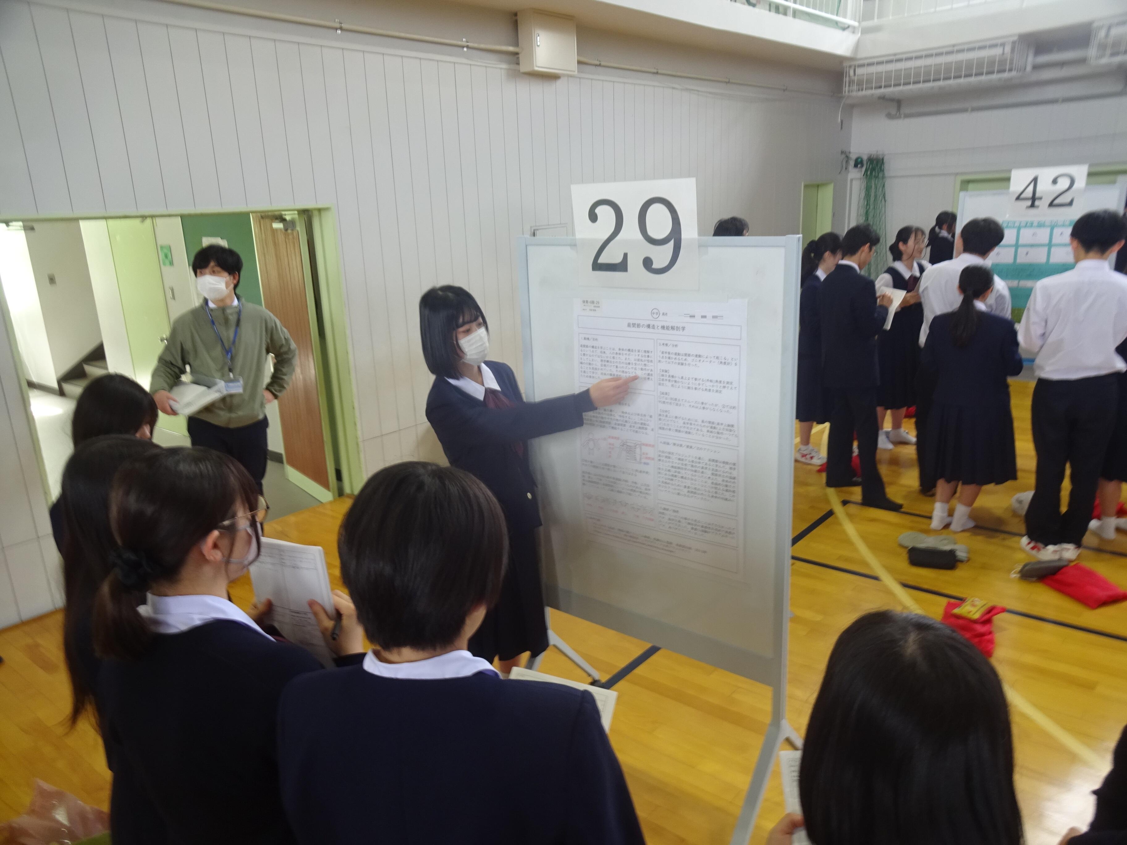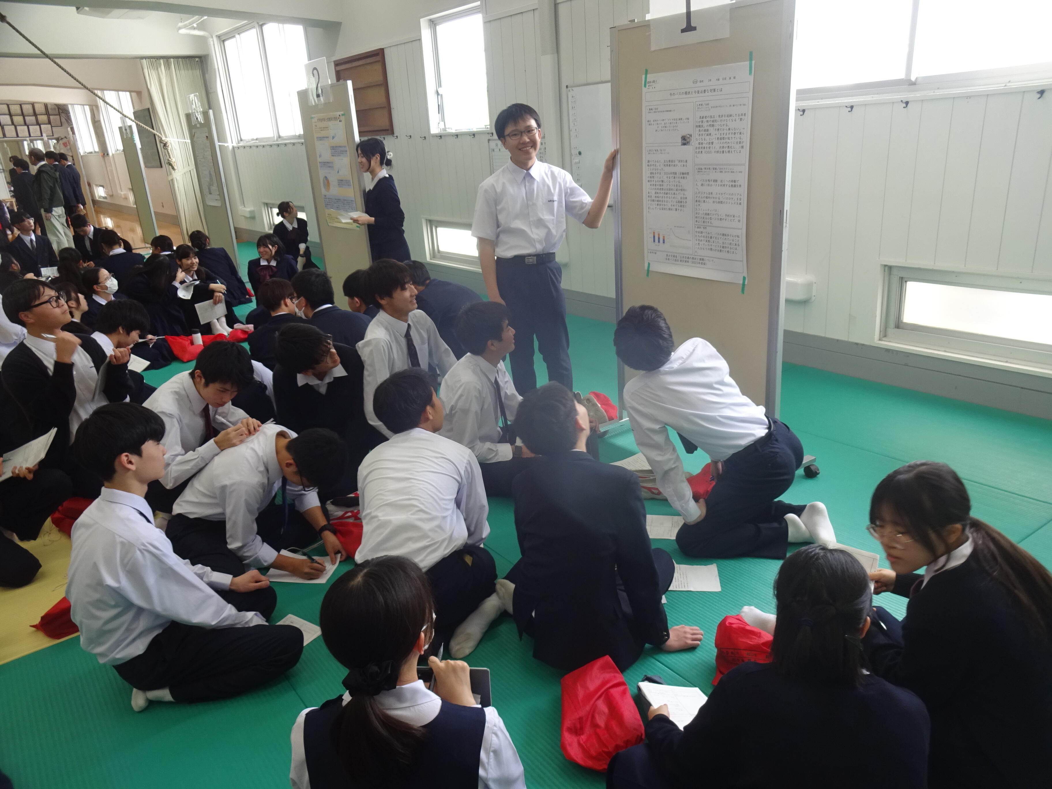 今日は午後からグローバル探究EXPOが開催されました。これは本校一年間の探究活動の集大成とも言える催しで、探究ゼミ・探究プログラム、授業DS探究、海外研修などの体験者がその成果を1枚のポスターにまとめて、聴衆へ発表する機会です。一貫生の中には発表者もいて、堂々たる発表ぶりでした。文理生は発表を聞く態度がすばらしかったです。前のめりに聞き、反応よく、質問も多くしていました。