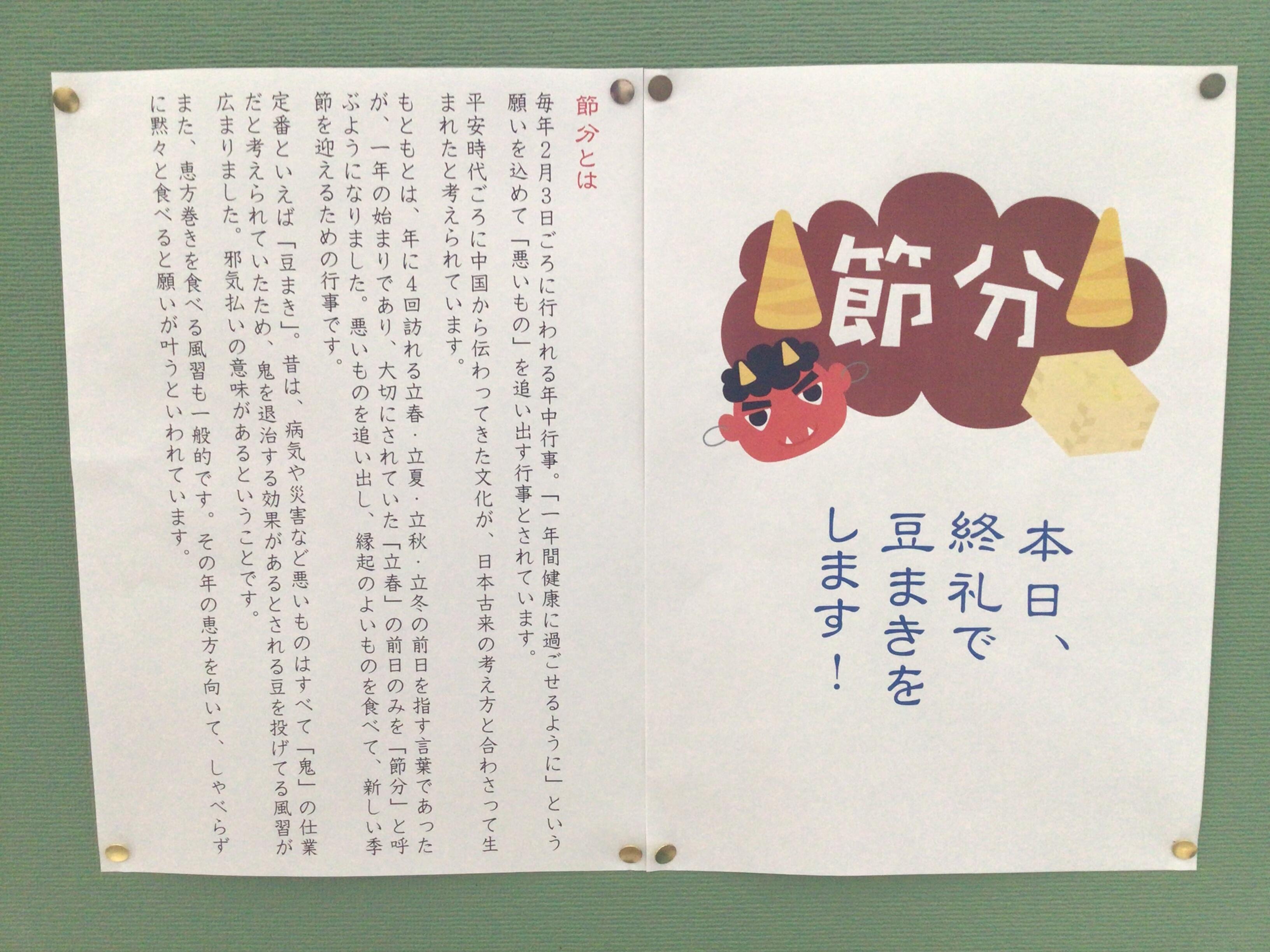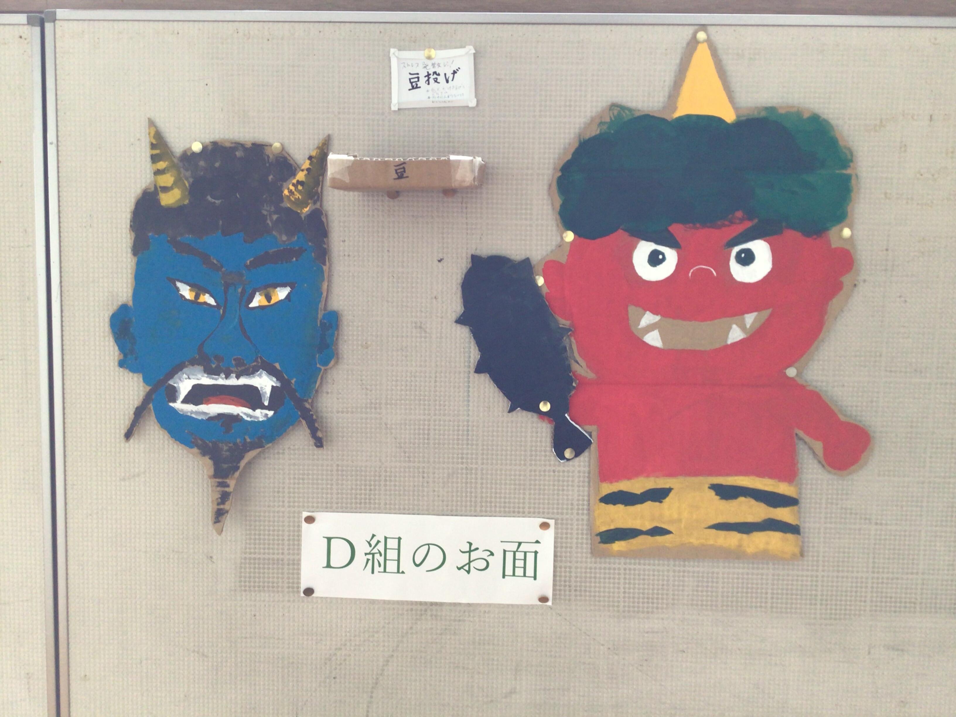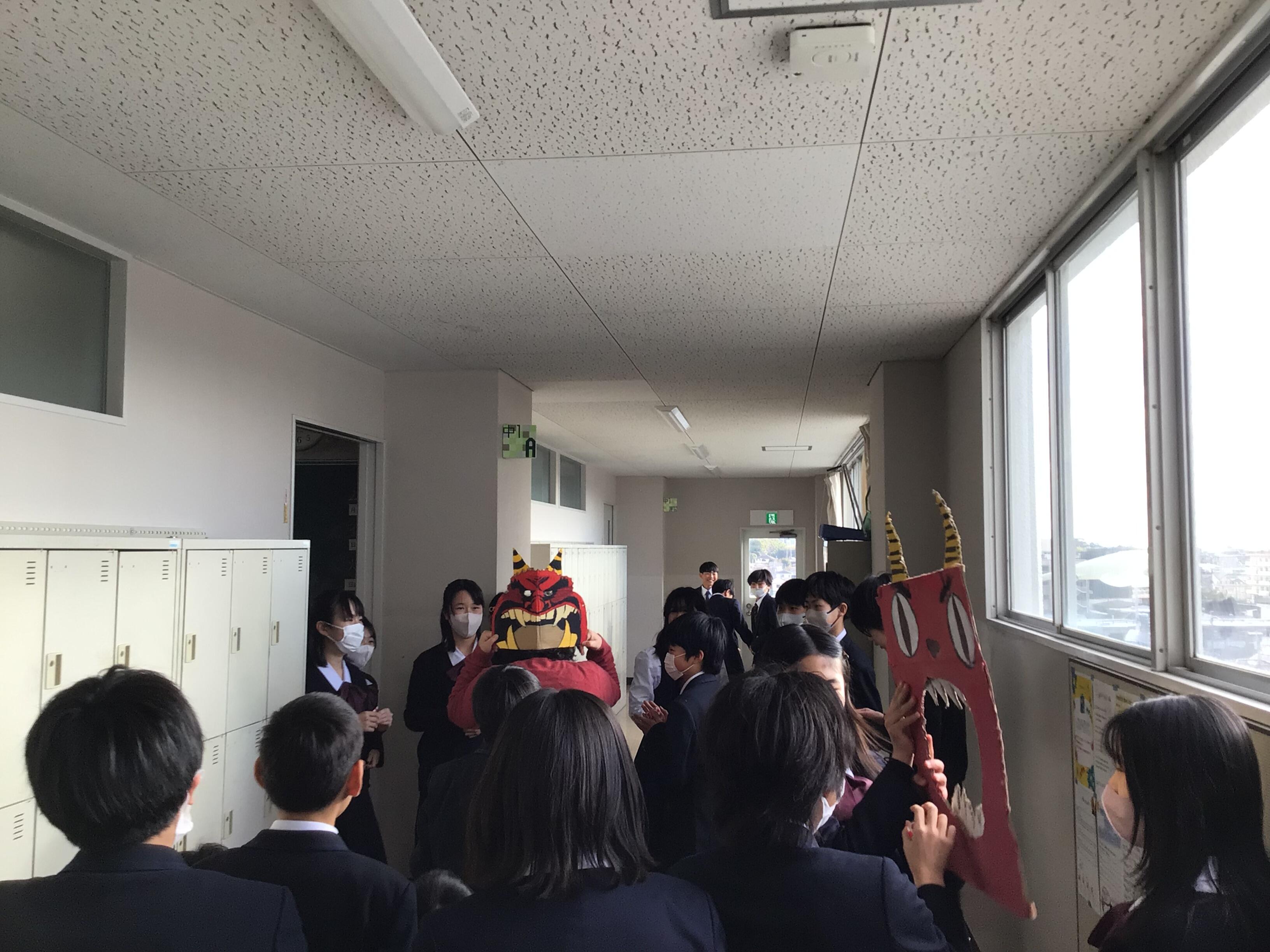 参観後、RTにて豆まきをおこないました。クラスごとにおこなう予定でしたが、最終的に学年全員が入り乱れての「豆まき合戦」となりました。各担任・担任代行・クラス代表者が鬼になり、教室・廊下を逃げ回りました。みな、しっかり厄払いができましたね。これですっきり勉強に集中できます!!学年末考査に向けて頑張ってきましょう!!!