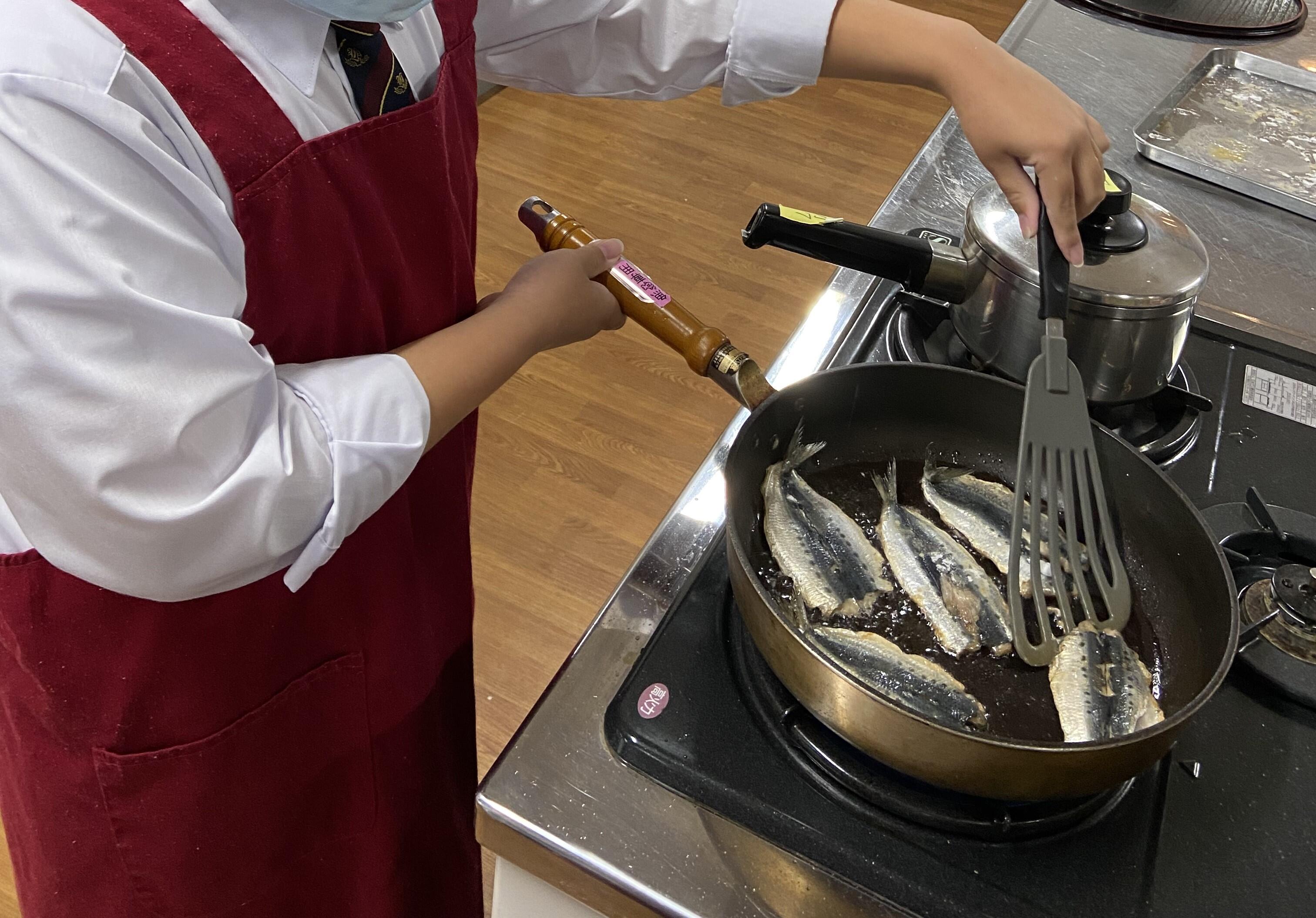 今回のメニューは「鰯(いわし)の蒲焼き」と「お味噌汁」です。 鰯は、生徒たちが自分たちの手で開きました。包丁ではなく手を使うことで、魚の感触を直に感じ、「命」をいただいていることの重みを学ぶ大切な機会となりました。甘辛いタレの香りが食欲をそそります。