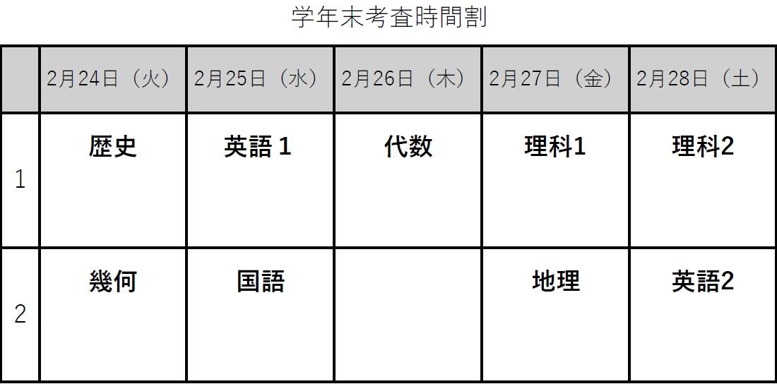 学年末考査の時間割です。上手に計画を立てて学習を進めてください。