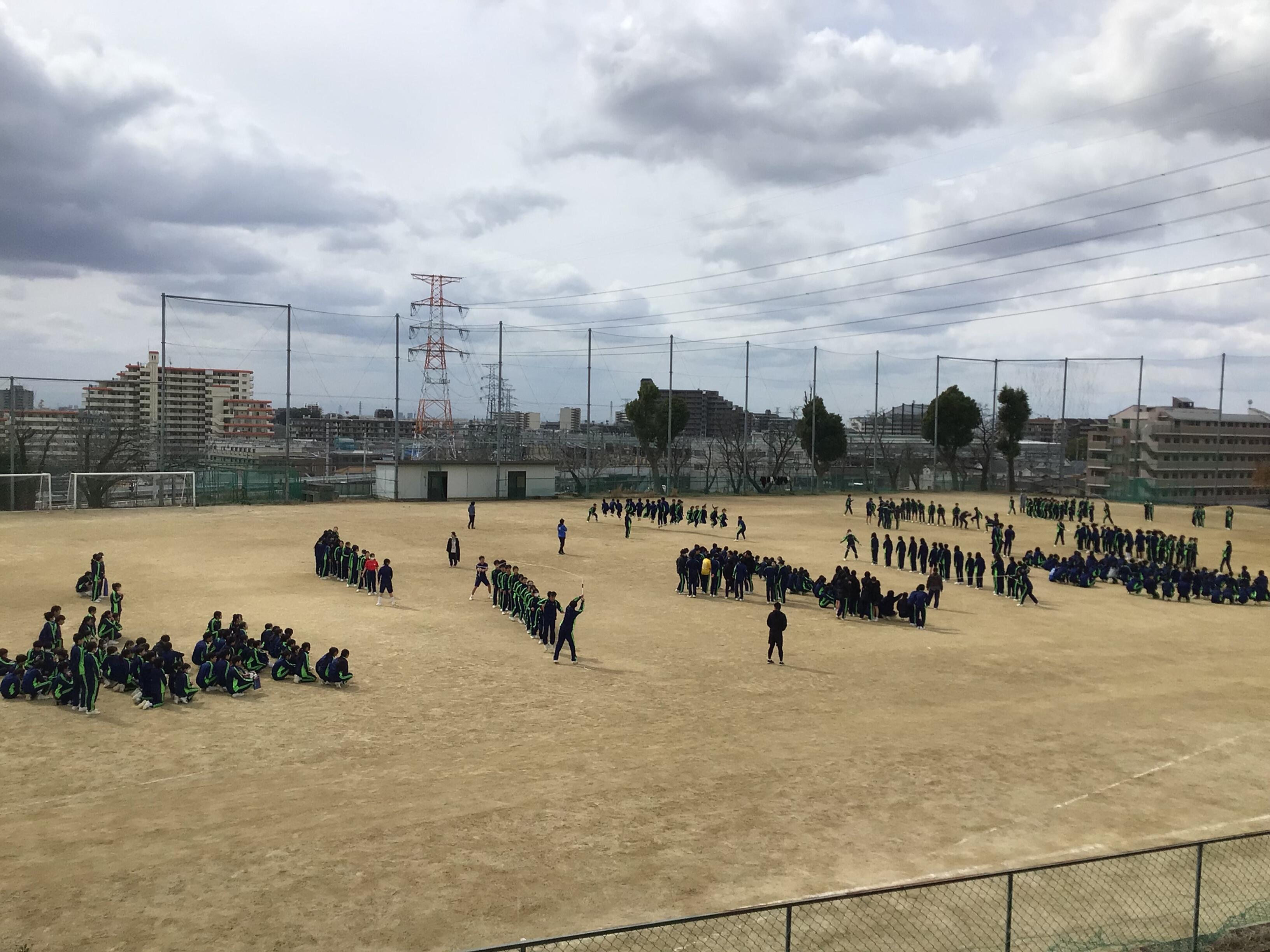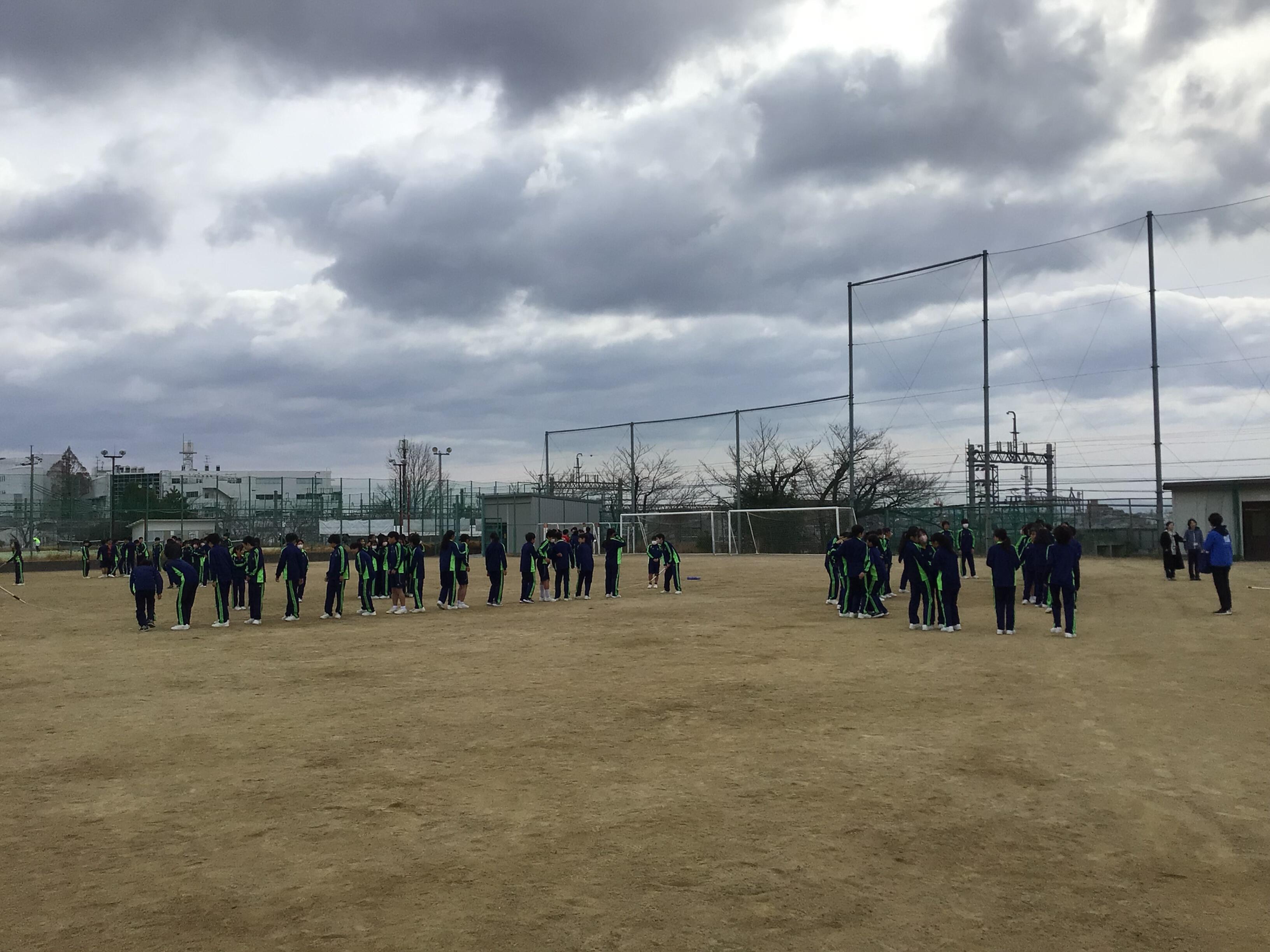 1限目は練習、2限目に団対抗で大会をおこないました。途中強風が吹き、風の勢いと寒さと戦いながら、工夫して練習をしていました。大会結果は、優勝が赤団(A組)、中1A組は1年生ながらクラス対抗の部でも3位に入る健闘ぶりでした。団体競技は、気持ちを一つにして取り組むことが大切ですね。